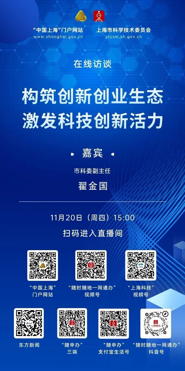 11月20日(周四)下午15:00,市科委副主任翟金国将做客“中国上海”门户网站在线访谈,本次访谈以“构筑创新创业生态,激发科技创新活力”主题,结合上海科技创新工作总体情况和下一步考虑,聚焦科技创新策源、科技成果转化、创新主体培育、科技创新生态和承载区建设等方面进行介绍。