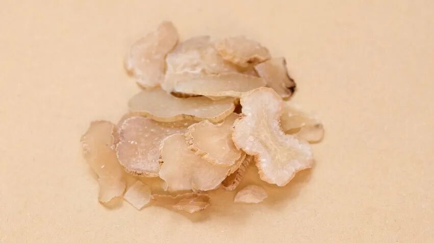 天麻由块茎洗净,蒸透,低温干燥,断面黄白色,角质样
