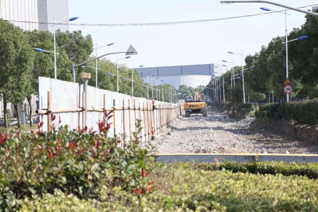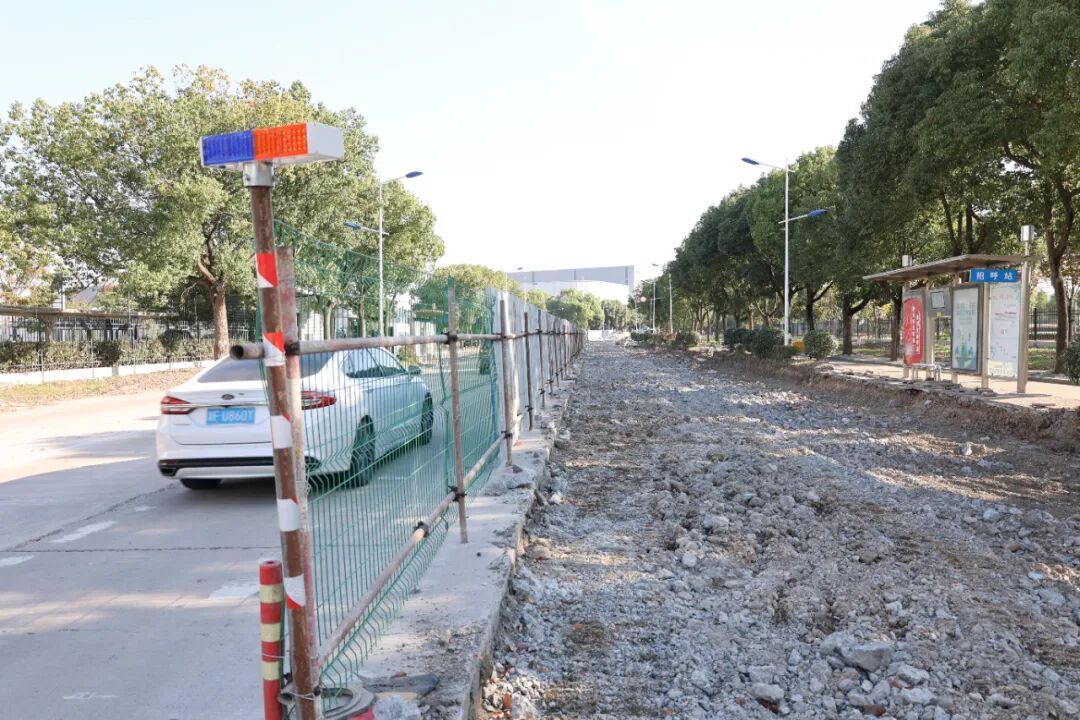 考虑到周边企业密集,为最大程度减少施工对车辆出行及企业生产的影响,工程采用“半幅施工、错峰作业”模式,分三阶段推进封路施工。“我们先对南侧半幅道路进行施工,保留北侧车道供车辆双向通行,同时保障非机动车道和人行道正常使用。”现场施工负责人姚建青指着施工区域的隔离挡板说,“待南侧半幅道路施工完成后再转入北侧半幅作业,最后集中改造非机动车道与人行道。整个过程像‘轮流换装’,尽可能降低对通行的干扰。”与此同时,提前与沿线企业逐一沟通,为企业预留专属通行区域,并同步设置醒目的警示提示牌,全力保障企业货运及人员出行需求。