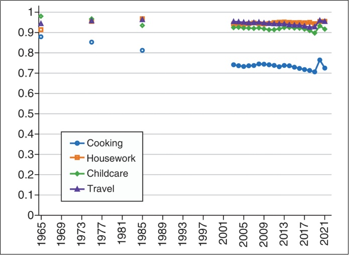 住户生产的市场化趋势 为追踪住户生产的市场化,我们需要在市场上为住户生产的产品找同质品(Equivalent)。文章使用BEA的详细个人消费支出表格,7种产品中只有4种具有独立报告数据的市场同质品。作者为烹饪匹配“餐食和非酒精饮料”,为旅行匹配“地面交通”,为照料儿童匹配“照料儿童”,为家务劳动匹配“家政服务”和“洗衣”两者之和。个人消费支出表格的报告数据中,找不到园艺、零工或购物三者的同质品。 已经找到同质品的产品足够支撑对市场化的检视,这些产品覆盖79%的住户生产时间,且覆盖大多数时间下降所对应的两种产品——烹饪和家务劳动。即使没有被包含的三种产品确有市场同质品,独立报告数据这件事情本身,也说明这些产品的市场份额很小。 图1 住户生产产品的市场化,1965-2021 图1呈现住户生产在4种(具有市场同质品)产品的消费支出中所占份额。文章同时考察长期趋势(1965-2019)和新冠肺炎影响(2020-2021)。被消费产品中的绝大多数都是由住户生产的,4种产品中只有烹饪产品的市场生产份额超过10%。照料儿童的市场化程度排第二,但也只是在2019年达到市场化程度最高点10%,甚至如此小的市场化程度都有可能是被高估。原因是,为避免报告数据不一致,顺带(Secondary)照料儿童,即在做其他活动的同时照料儿童的活动,在住户生产卫星账户中被省略。虽然人们对如何评估这段时间的价值存在疑问,但顺带照料儿童的时间很长,可能代表巨大的住户生产价值。 到底是什么导致了住户生产相对于GDP比值下降呢?烹饪是唯一一种展现出由住户生产向市场生产大幅转换的产品,对市场化烹饪消费由1965年的12%上升至2019年的29%。考虑烹饪在住户生产中占比颇高,这种产品既很重要又展现出明显的市场化趋势。照料儿童也显现出市场化趋势,市场化的照料儿童消费由1965年的2%上升至2019年的10%,但该产品在住户生产中占比相对较小,故对市场化的贡献偏小。家务劳动和旅行没有展现出市场化趋势,家务劳动在时间有所减少的同时,由市场生产的份额也略微下降。整体而言,住户生产相对GDP比值呈现显著下降趋势,而仅有烹饪一种产品展现大幅度市场化。 在新冠疫情期间,许多产品的市场化选择权利都因为隔离和疾病本身而被中断。2020年,烹饪、旅行和照料儿童呈现明显的去市场化(De-marketization),但2021年已部分恢复到疫情前的趋势。不能仅把上述趋势理解为商业周期向住户部门的转变,而应当理解为市场选择权利的丧失,是去市场化的重要原因。 04 对家庭/市场时间分配的启示 以上发现能为解释工作和时间从住户流向市场的提供哪些启示?研究表明,住户生产时间的缩短由多种因素导致。家用电器似乎是一种因素,这与Greenwood等(2005)观点一致。这种影响在家务劳动中最为明显,尽管家务劳动的产出从市场上转移出去,但家务劳动时间却反而减少,这表明这些任务变得自动化。新冠疫情期间,家务劳动市场份额没有变化,表明市场上的替代品对该产品而言并不重要。 如须全面掌握住户生产的变化,还应当考虑其他因素。对住户生产相对GDP下降的解释需要回答,为什么烹饪显著市场化,但其它产品并没有。如果用女性在住户之外(即市场)劳动报酬提升来解释烹饪的市场化,则理应推理所有产品都会转移出住户,但其实并没有。因此还需要其它因素来支撑更全面的核算。 结论 尽管住户生产对GDP的相对重要性有所下降,但大多数住户生产产品并未呈现出市场化。1965-2021年,只有烹饪市场化程度显著提高,家务劳动市场化程度有所下降,这契合家用电器将某些任务自动化的想法。新冠疫情导致大多数住户生产产品呈现出去市场化,这对应市场选项被干扰,生产转移到住户部门。这一转变在很大程度上是暂时的,因为2021年大部分产量恢复到疫情前的水平。 一个有趣的扩展思路是将该框架应用于其他国家。由此可探讨众多问题,包括公共政策对女性劳动力参与的影响有多大。此外,有人认为照料儿童方面公共补贴的差异是造成跨国差异的原因,而考察照料儿童的市场化程度将有助于检验这一假设。 责编:薛依宜