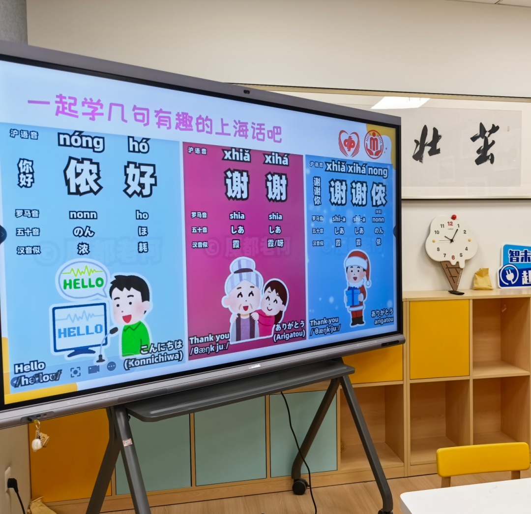 随后的沪语互动课让现场氛围更加轻松。社工老师借助徐汇区的地标建筑,引导孩子们学习“龙华寺”“上海体育场”等地名的沪语读法,还带领大家练习了日常生活中常用的沪语表达。“谢谢侬”“一道白相”等词语,在孩子们的跟读声中慢慢变得活泼起来。