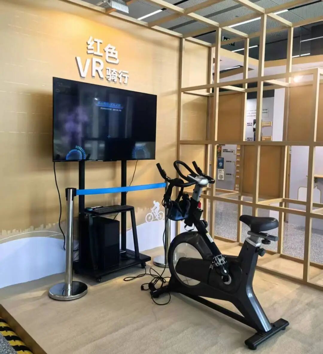 红色VR骑行是结合往届获奖作品创意与馆藏红色资源打造的沉浸式体验。该系统利用虚拟现实技术与室内骑行设备,将上海 12 条红色路线、沿途建筑与历史故事以沉浸式方式呈现,观众在骑行速度的变化中“穿行”于城市的红色记忆,边运动边了解建筑背景,在虚拟空间中完成一场连接数据与文化的体验,在互动中“骑行”城市历史。