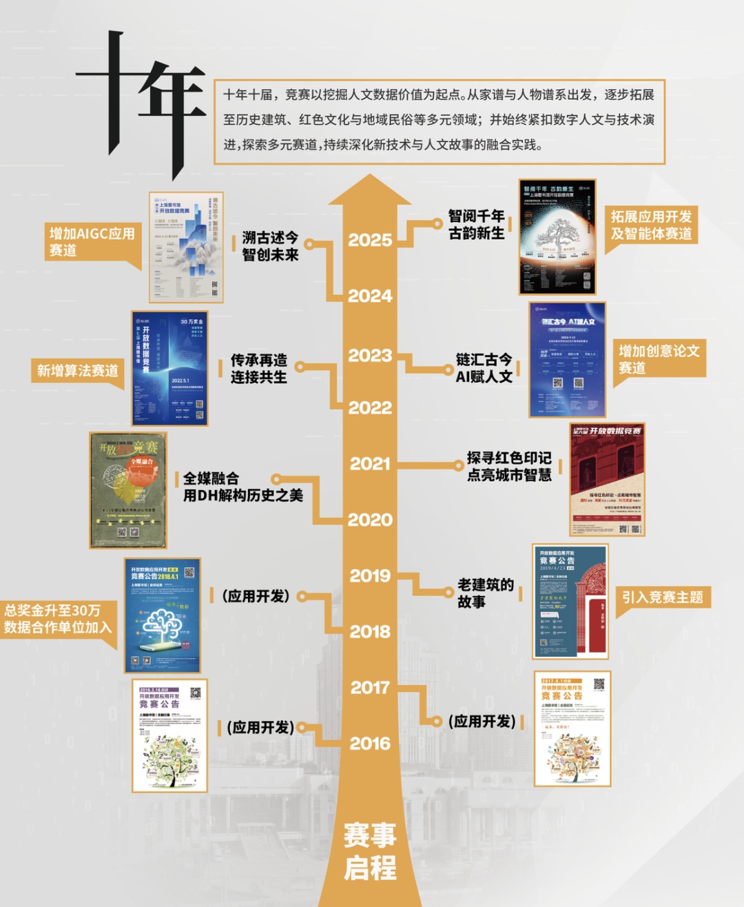 回望这十年,开放数据竞赛不仅是技术与创意的舞台,也是许多读者、学生、研究者第一次走进历史人文数据世界的入口。从解读一份家谱,到复原一段城市记忆;从用代码描绘古籍关联,到用 AI 生成新的文化表达——每一届竞赛都留下了独有的时代印记,也让越来越多的人看到数据背后蕴藏的故事与可能性。