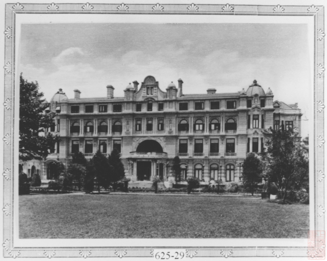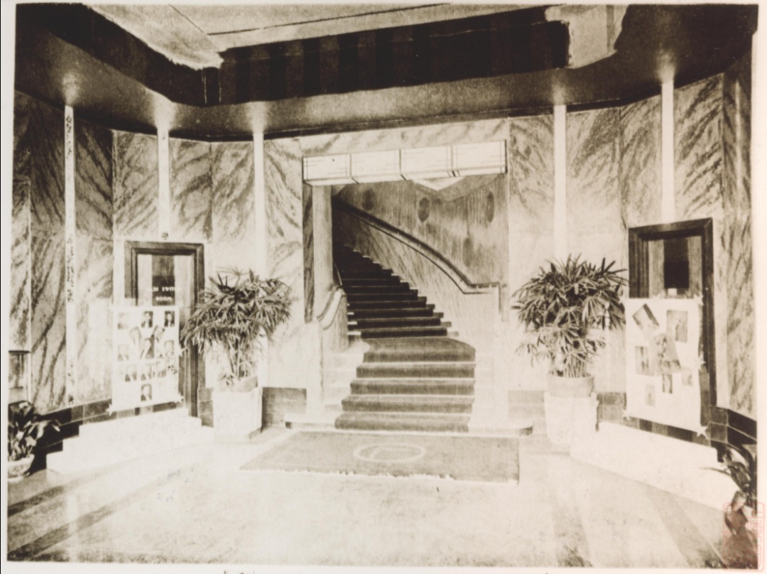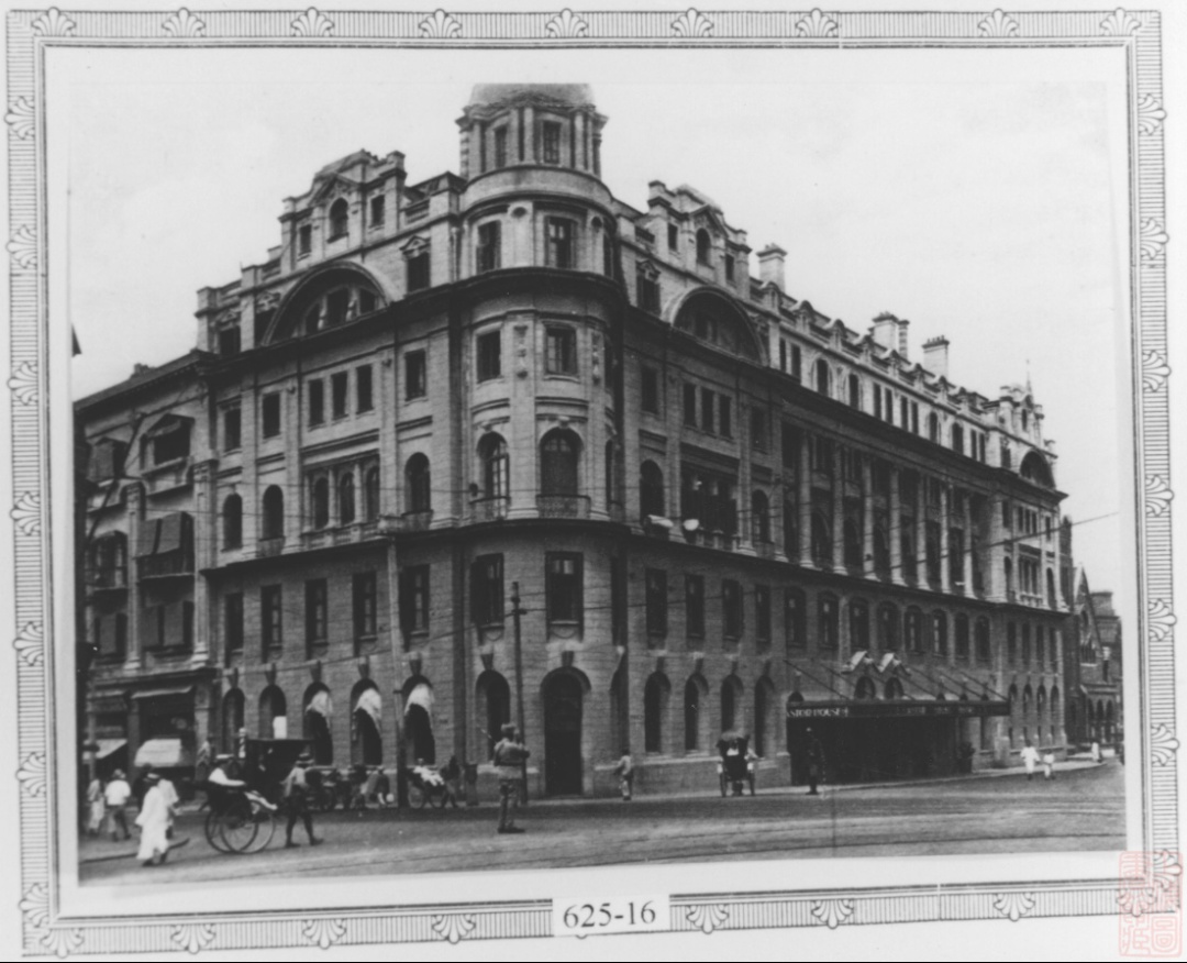 (左上)百乐门大饭店——大门内;(左下)百乐门大饭店——舞厅休憩室;(中间)国际饭店;(右上)大华饭店;(右下)礼查饭店