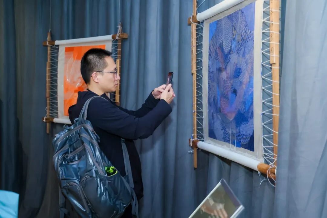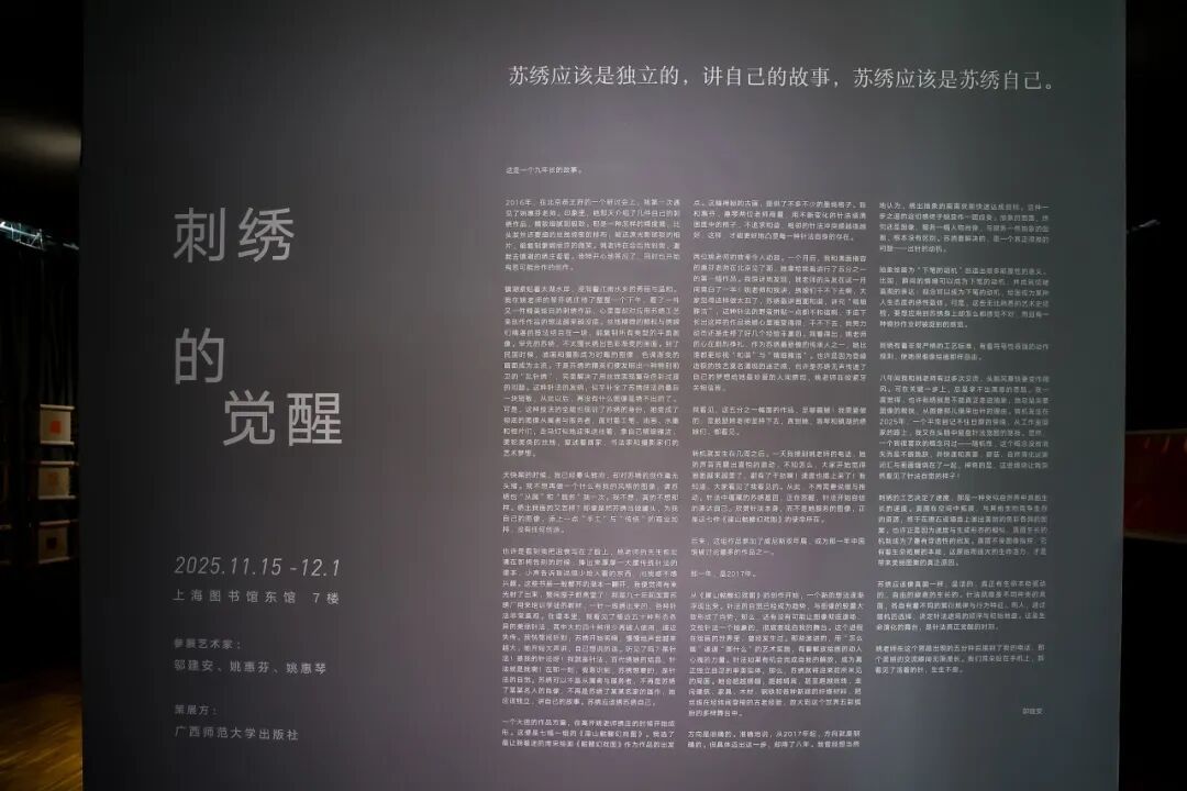 刺绣,是中国千年手工艺的精粹,而苏绣更是其中以针法细腻、意境高雅著称的代表。而本次在蓝色帷幕搭建成的“剧场”中的刺绣展,试图突破刺绣作为“技艺”或“图像附庸”的传统认知,探索针法本身如何成为独立的审美主体与精神表达。