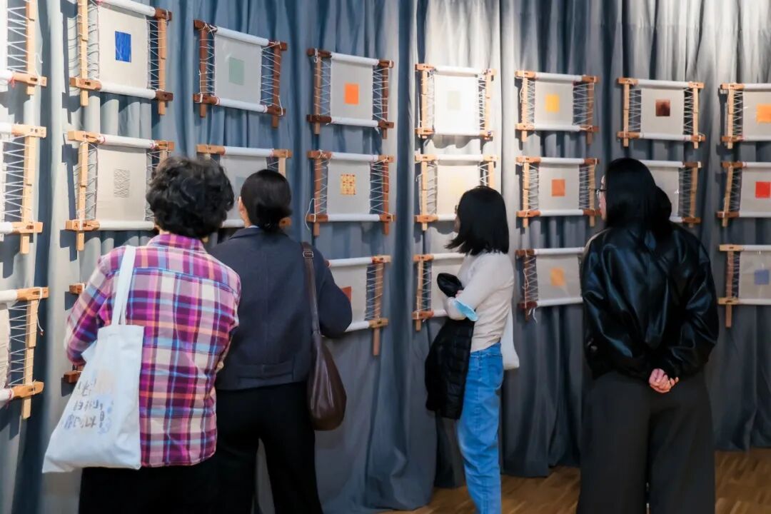 本展区呈现的是脱离图像的抽象刺绣作品:所有作品均为单色方块,通过一种颜色的丝线,借助针法的穿插、叠压、疏密与节奏变化,构建出丰富的肌理与光影层次。这些方块不再是“图案的载体”,而是针法自身的纯粹表达——针脚成为笔触,丝线成为颜料,刺绣成为一门自律的艺术。