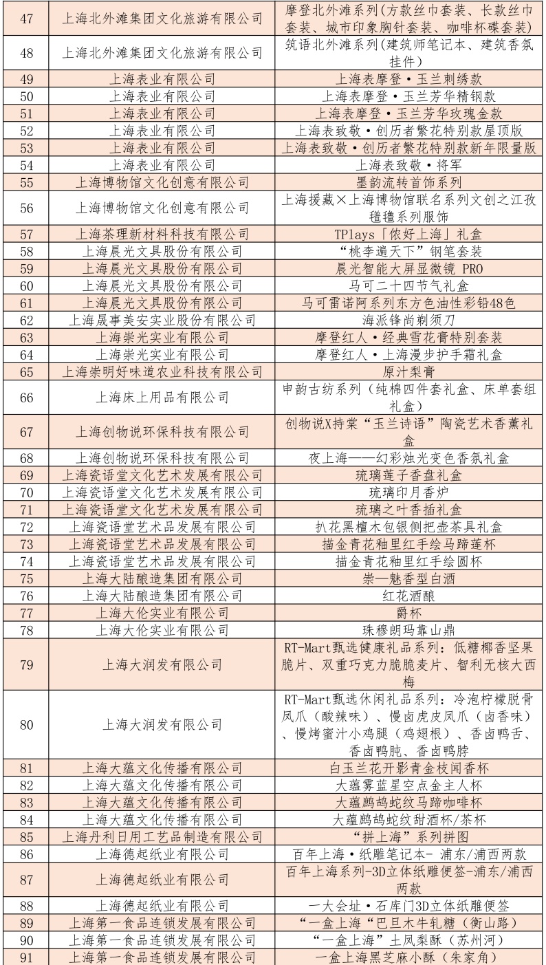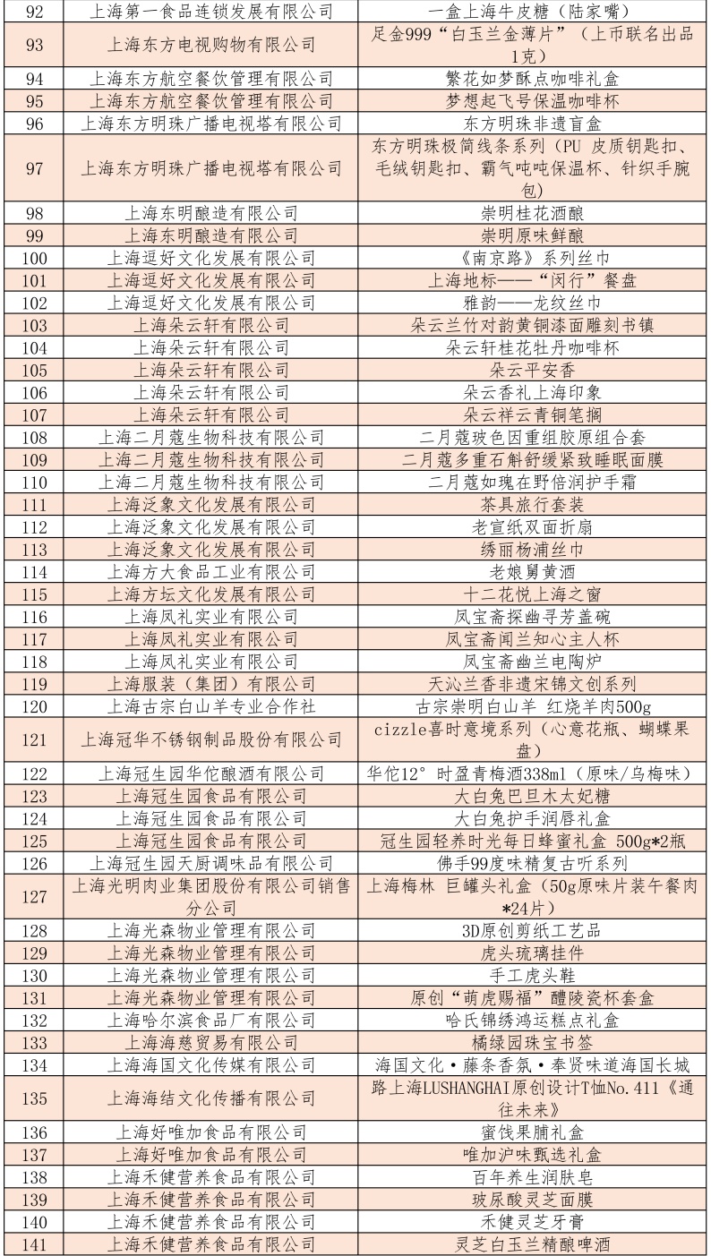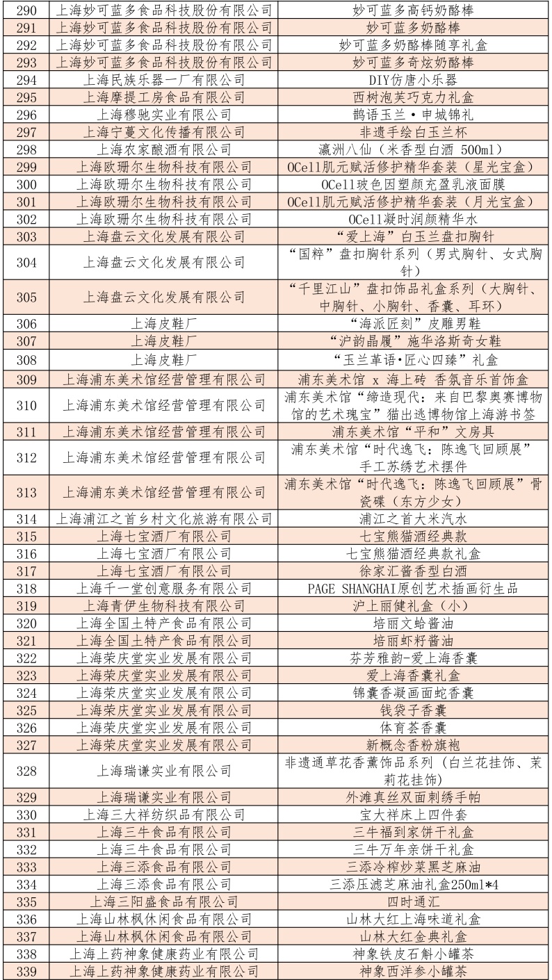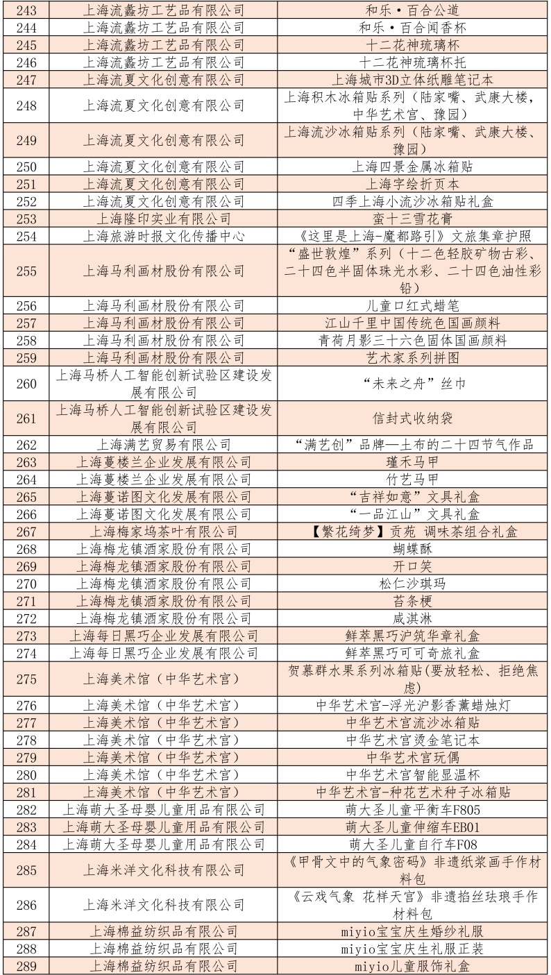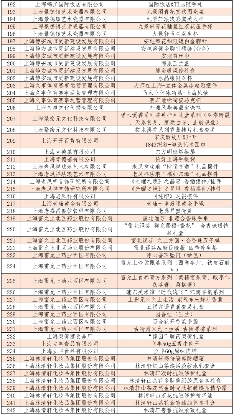 市文化旅游局介绍,在其指导下,上海市商业联合会、上海市旅游行业协会联合开展了2025年“上海礼物”品牌商品评选和认定。经资质查询、企业征信、专家认证和领导小组评审,561件商品入选2025年“上海礼物”品牌商品。一起来看↓ 上图为部分2025年“上海礼物” 根据《“上海礼物”商品评选及标志标识管理办法(修订稿)》第八条第一款,“经评审获‘上海礼物’认定的品牌商品自公布之日起有效期为叁年,有效期过后企业须重新申报”,2022年“上海礼物”品牌商品自本名单公布之日起废止。 2025上海礼物品牌商品入选名单 (按拼音顺序)