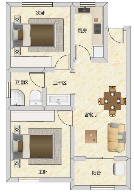 卧室:双人床、床垫、床头柜、衣柜、空调等;