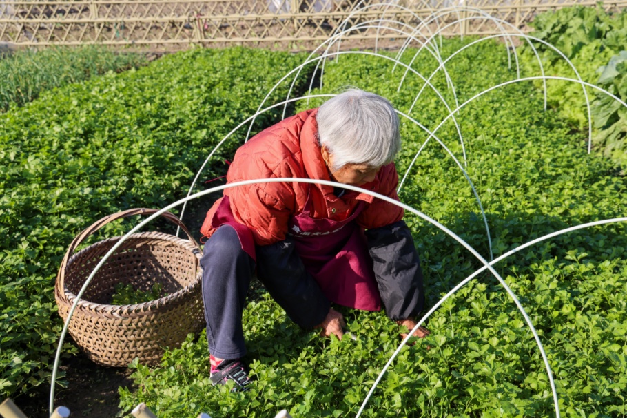 上午,记者来到朱泾镇秀州村唐月芳的自留地看到,芹菜、青菜、萝卜、白菜等各类蔬菜长势喜人,透着旺盛的生机。唐阿姨挎着竹篮在地里忙碌,手上的动作麻利又轻快,不一会儿就割满了一篮新鲜蔬菜。她笑着告诉记者:“现在天气冷了,霜打后的蔬菜吃起来口感不一样,嫩、甜、糯。”