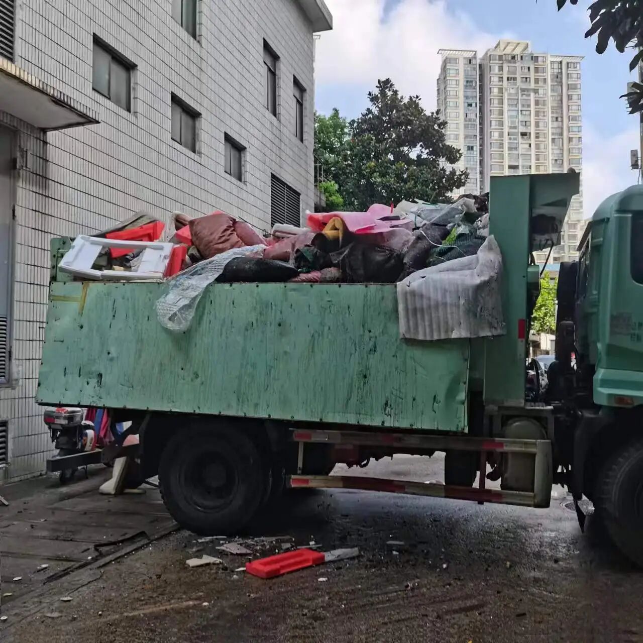 如今再走进地下室,大多房间已清空,一扇扇带锁的门被拆除,通风变好了,霉味也在减轻。租户搬离时遗留的垃圾,由物业和街道进行托底清理。物业清走6车,街道城运中心清走4车,每车8吨。上下两层的地下室,堆积如山的垃圾,全靠物业、保安和保洁一点一点人力搬到地面垃圾箱房,再由垃圾车清运。高温季节里,工作人员汗如雨下,但他们毫无怨言。目前,物业正在进行最后的垃圾清运工作。