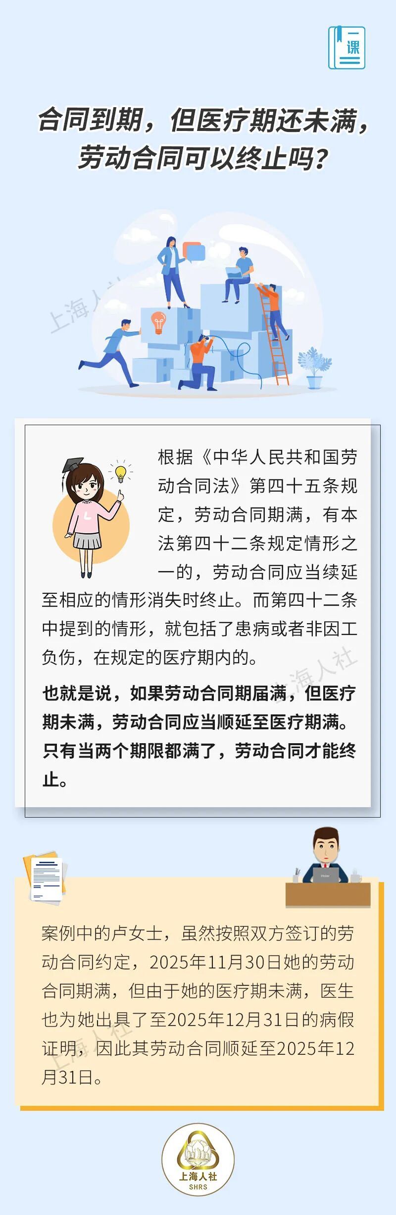 卢女士是一家餐饮企业的市场经理,2022年12月1日入职,劳动合同期限为3年。今年9月份以来,她一直觉得自己腰疼,11月1日,经医院检查为某慢性疾病,急需静养,于是给她开了2个月的病假(11月1日至12月31日)。但卢女士的劳动合同即将于11月底到期,届时单位可以提出终止劳动合同吗?