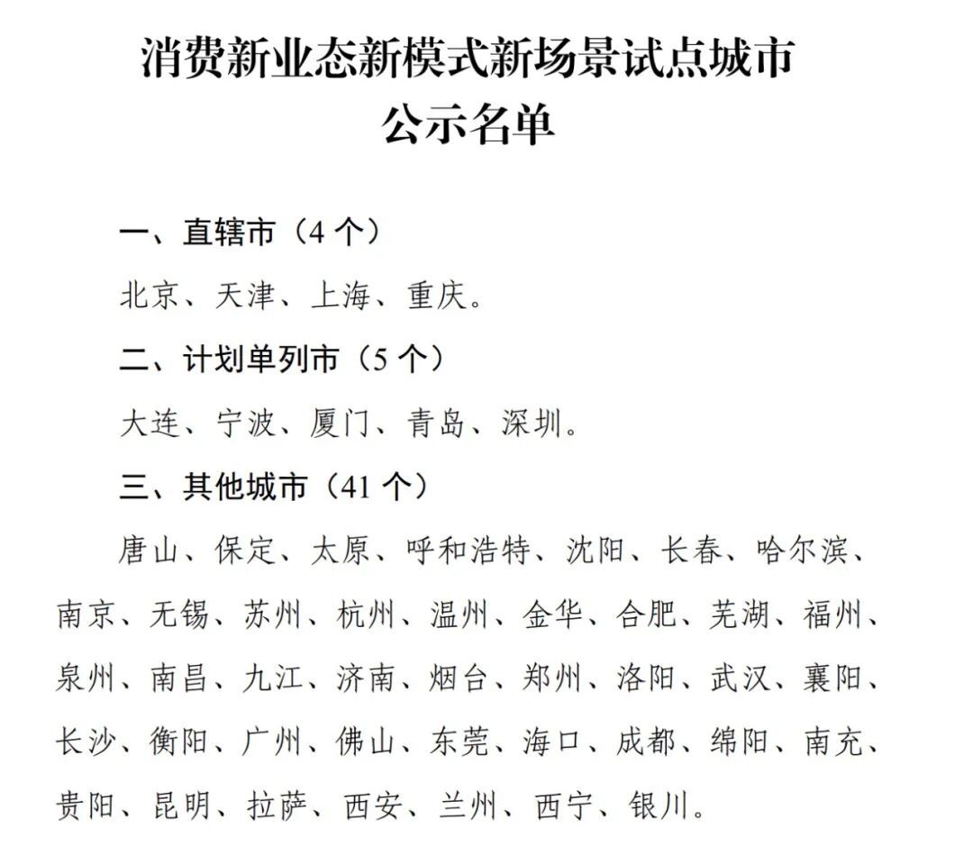 财政部11月20日消息,财政部、商务部公布消费新业态新模式新场景试点城市竞争性评审结果。公示名单共包含50个城市,其中有直辖市4个,包含北京、天津、上海、重庆;计划单列市5个,包含大连、宁波、厦门、青岛、深圳;其他城市41个,包含唐山、保定、太原、呼和浩特、沈阳、长春、哈尔滨等。