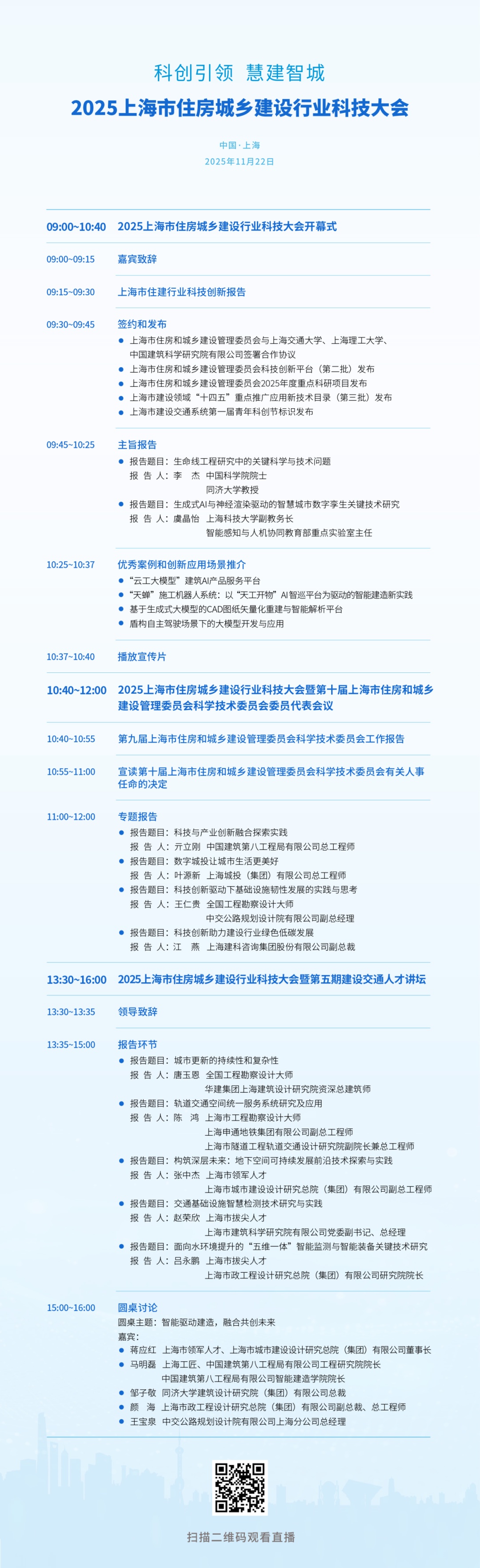 2025上海市住房城乡建设行业科技大会将于11月22日(周六)开幕。本次大会以“科创引领,慧建智城”为主题,还将重磅发布上海市住建行业科技创新报告。一起来看会议议程和直播入口↓