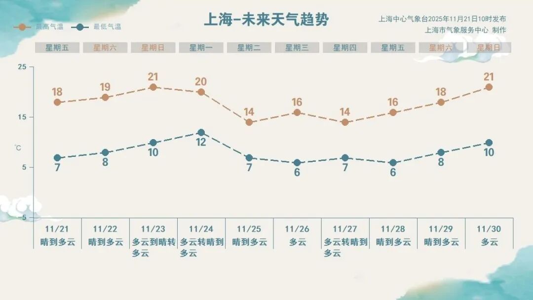 上海市中心气象台预报员金妍告诉记者:“周末本市主要是受地面高压的控制,天气较为晴好,气温逐步回升。其中周日最高气温可达21℃左右。但夜间受辐射降温的影响,昼夜温差较大,请市民朋友注意及时增减衣物。24—25日和27日的前后,会有两次冷空气过程,但强度偏弱。其中主要的降温时段出现在25日,届时24小时的过程降温可达6℃左右,请大家关注气温变化,注意防寒保暖。”