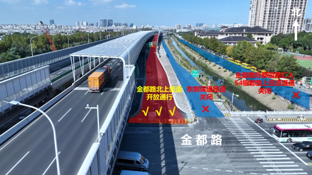 1.金都路北上匝道开通后,金都路都园路交叉口将同步关闭,机动车将无法右转进入都园路,仅保留慢行交通功能。同时,施工期间供金都路西向北通行的地面绕行道路也将同步关闭。