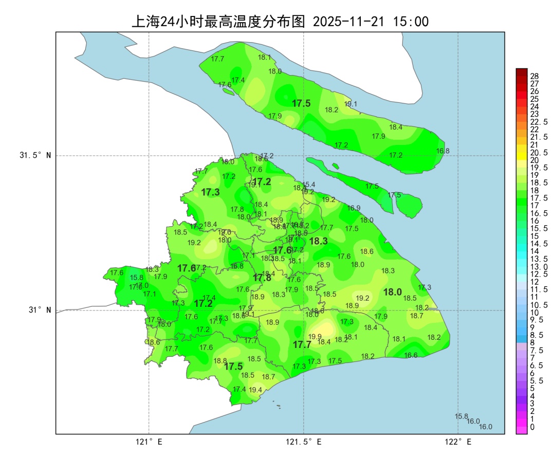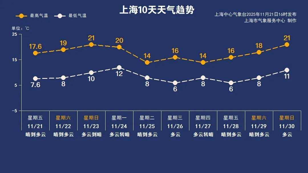 今天继续回暖,蓝天暖阳齐上线,各区最高气温普遍达到17~18℃,市区徐家汇站定格在17.6℃。之前上海已经连续三天平均气温低于10℃,仿佛有向冬天冲刺的劲头。从今天的气温变化来看,今日平均气温将高于10℃,所以入冬进程中断,美好的秋天还会延续。