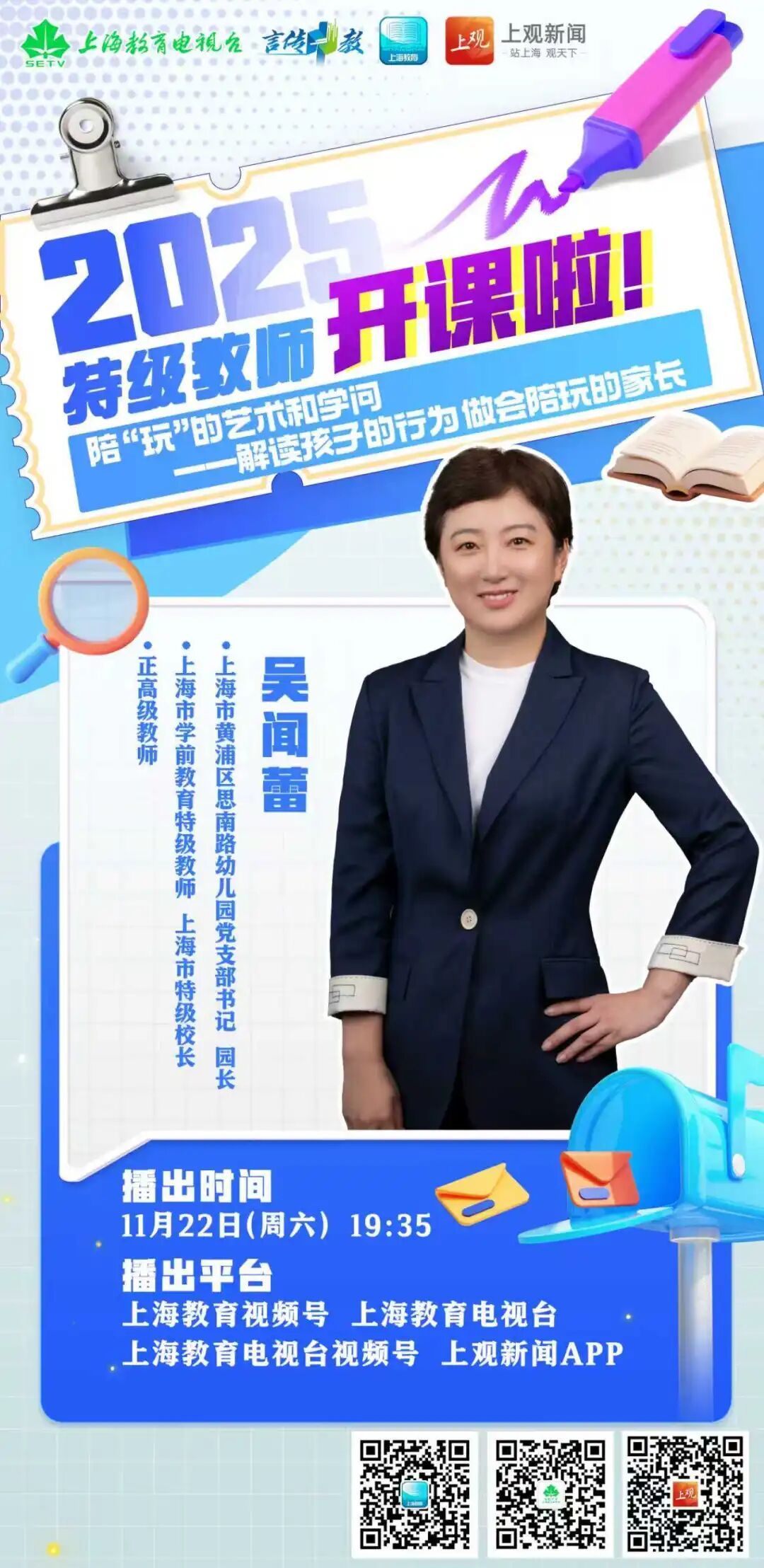 11月22日(周六)19:35,2025年“特级教师开课啦”将在上海教育视频号、上海教育电视台、上海教育电视台视频号、上观APP同步播出第五期。上海市黄浦区思南路幼儿园党支部书记、园长,上海市学前教育特级教师、上海市特级校长,正高级教师吴闻蕾带来的讲座主题是“陪“玩”的艺术和学问——解读孩子的行为,做会陪玩的家长”。