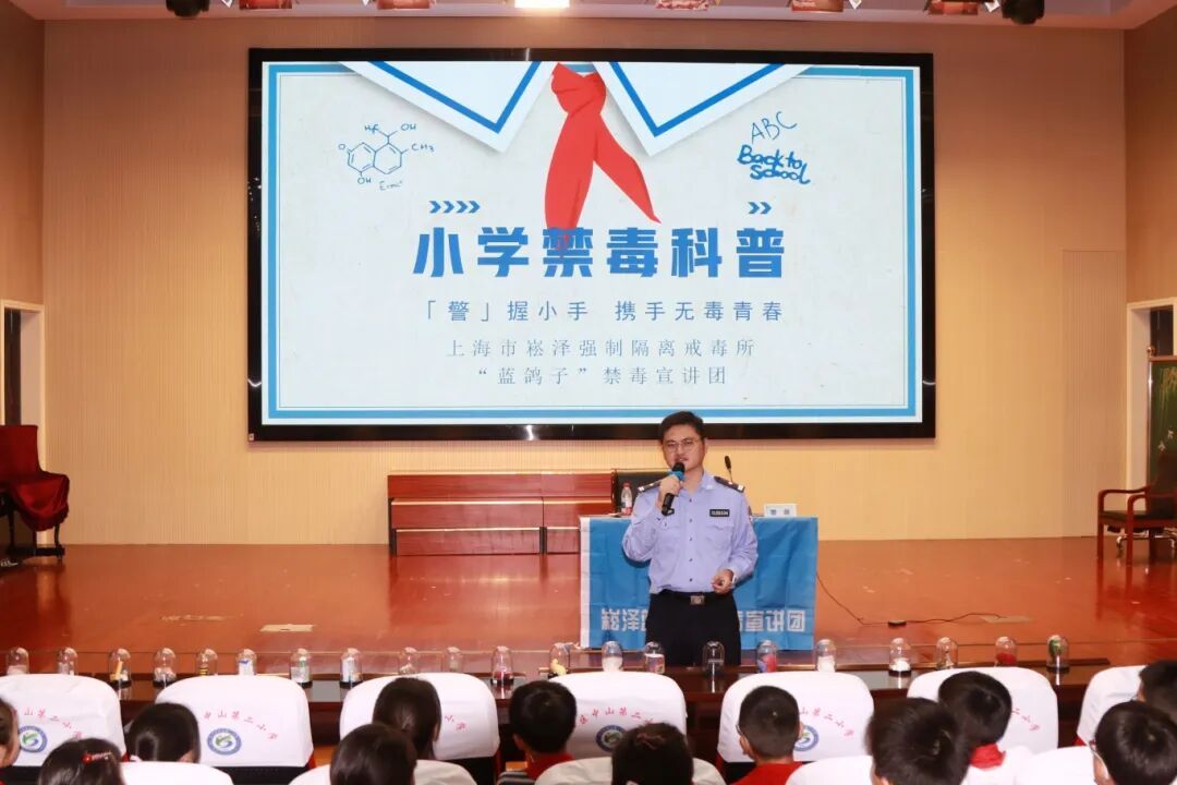 上外云间小学东校特邀上海市崧泽强制隔离戒毒所“蓝鸽子”禁毒宣讲团的曹晨警官,为同学们带来了一场主题为“警握小手,携手无毒青春”的禁毒专题讲座。讲座结合青少年认知特点,系统讲解毒品的常见种类、不同毒品对人体造成的具体危害,以及毒品成瘾的生理机制,增强学生的防范意识和应对能力。