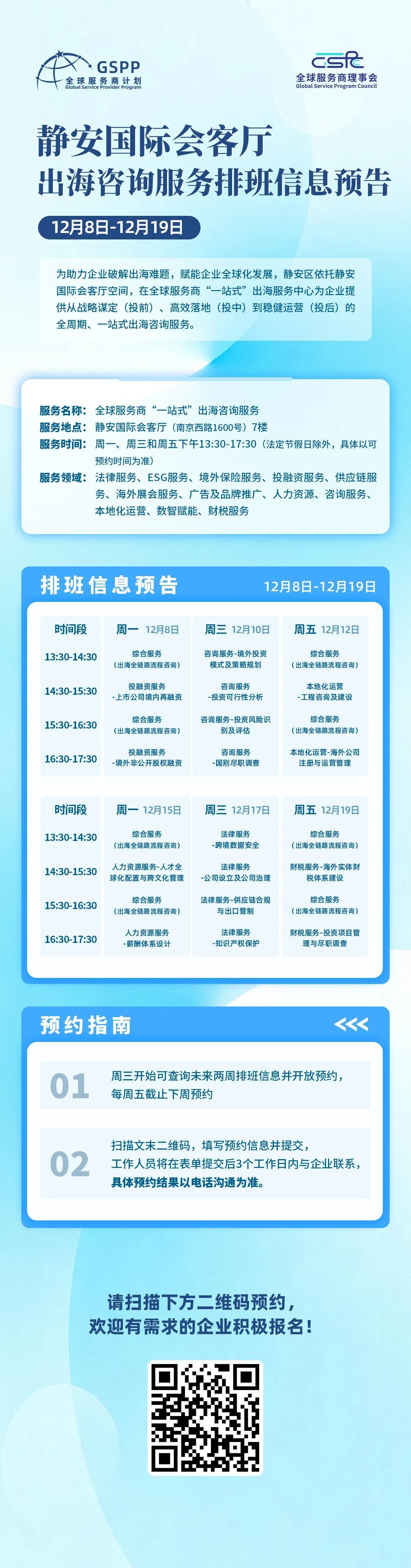 为助力企业破解出海难题,赋能企业全球化发展,静安区依托静安国际会客厅空间,在全球服务商“一站式”出海服务中心为企业提供从战略谋定(投前)、高效落地(投中)到稳健运营(投后)的全周期、“一站式”出海咨询服务。