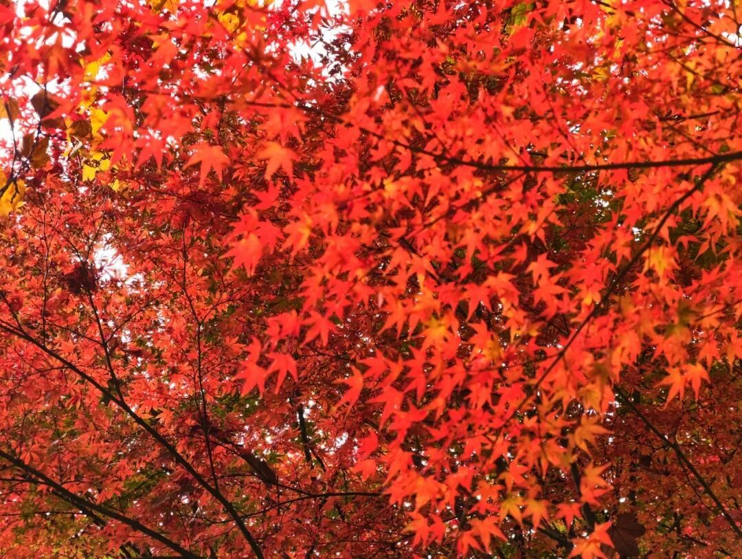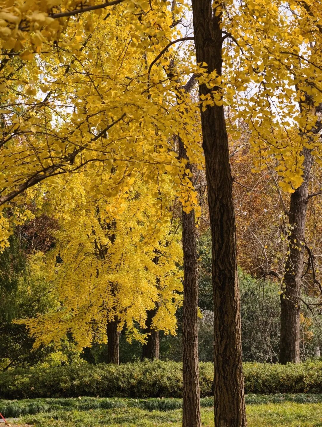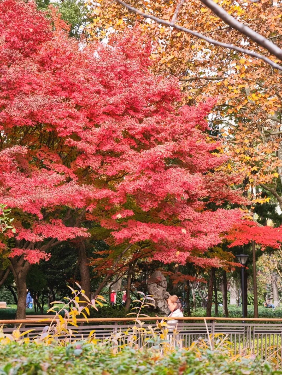 除了红枫,园内目前彩韵交织,无患子明黄清透,乌桕浅绛点点,银杏筛金,水杉锈红,悬铃木遍染暖褐……宛如打翻的天然色盘。