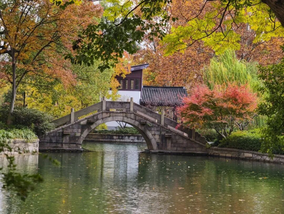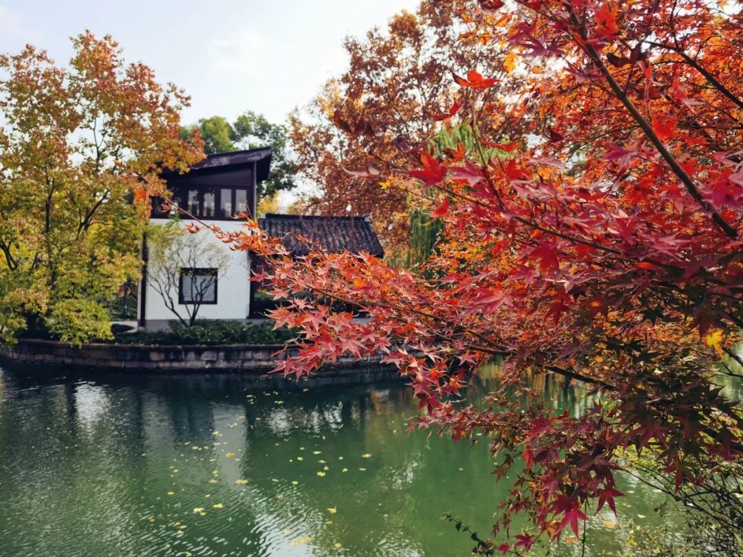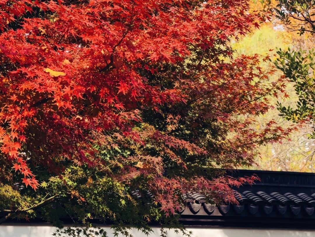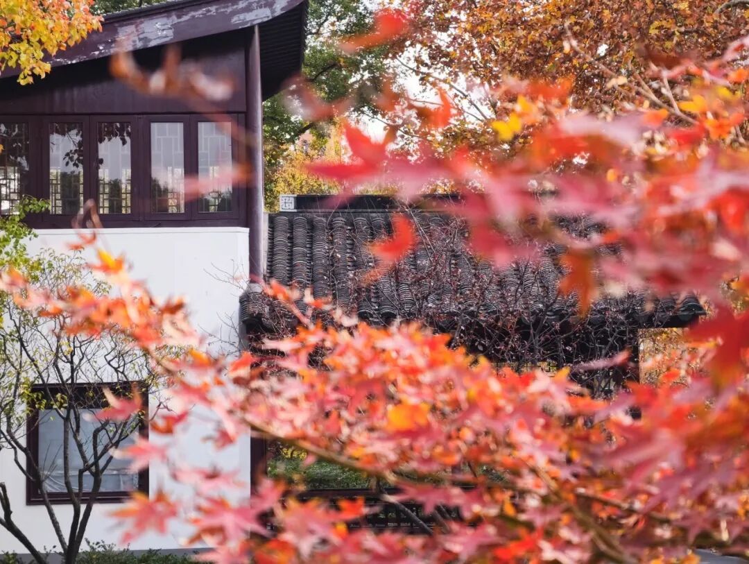 这里的红枫,或许规模不算大,却因依傍着园内中式古典建筑的白墙黛瓦,显得格外清雅入骨。风起时,红叶掠过翘角,拂过桥栏,亭台水榭间,将江南的婉约凝成一瞬的宁静。