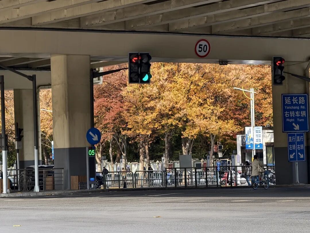 门外榉树广场更是惊艳——合抱之木撑开漫天斑斓,合抱之姿漫天斑斓,将高架路变成天然画框。