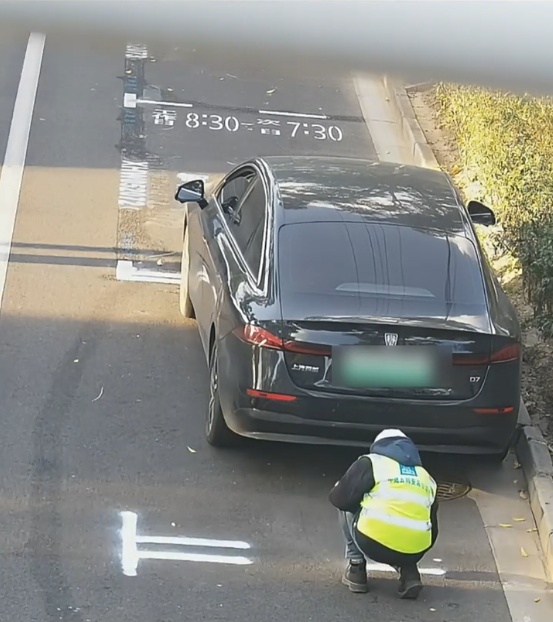 辅警第一时间将相关情况向带班民警进行了汇报。民警立即调取事发路段的公共视频监控进行回溯核查,最终锁定了违规行为的实施过程:一名身着反光背心、头戴安全帽的男子,携带白色喷漆来到该地点,在道路上私自喷涂,划定了两个车位,随后将自己驾驶的车辆驶入其中一个自划车位内停放,之后便自行离开。