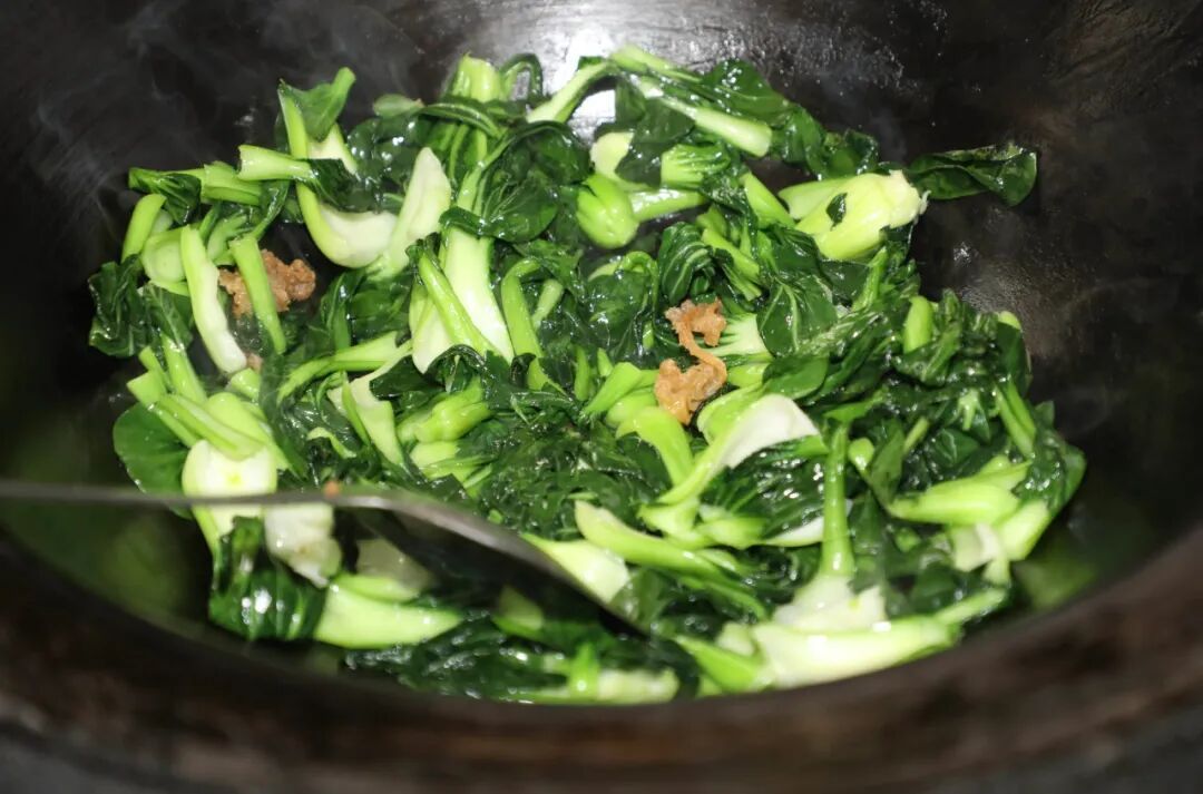 猪油熬成,便到了检验风味的时刻。周奶奶从附近小菜园里收割了几颗正值时令的青菜。“现在的青菜最好吃,经了霜,烧起来酥,还带点甜味。”她的话语里满是对时令馈赠的珍视。以自炼猪油快炒青菜,简单的烹调瞬间激发极致风味。猪油的丰腴醇厚,恰到好处地烘托出霜打青菜的清甜软糯,一道朴素的菜肴,成了连接土地、时令与家传味道的纽带。