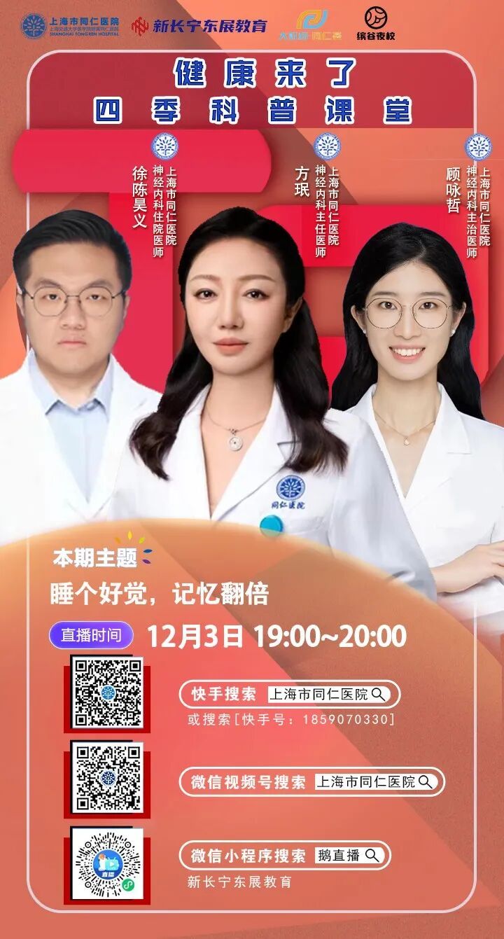 今天(12月3日)19:00—20:00,“上海长宁”APP将与上海市同仁医院“大虹桥·同仁荟健康直播”共同直播:睡个好觉,记忆翻倍。