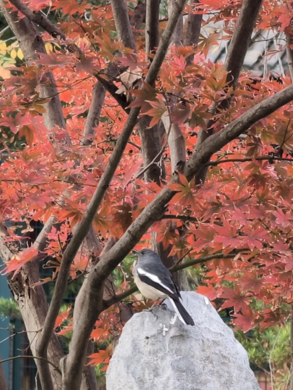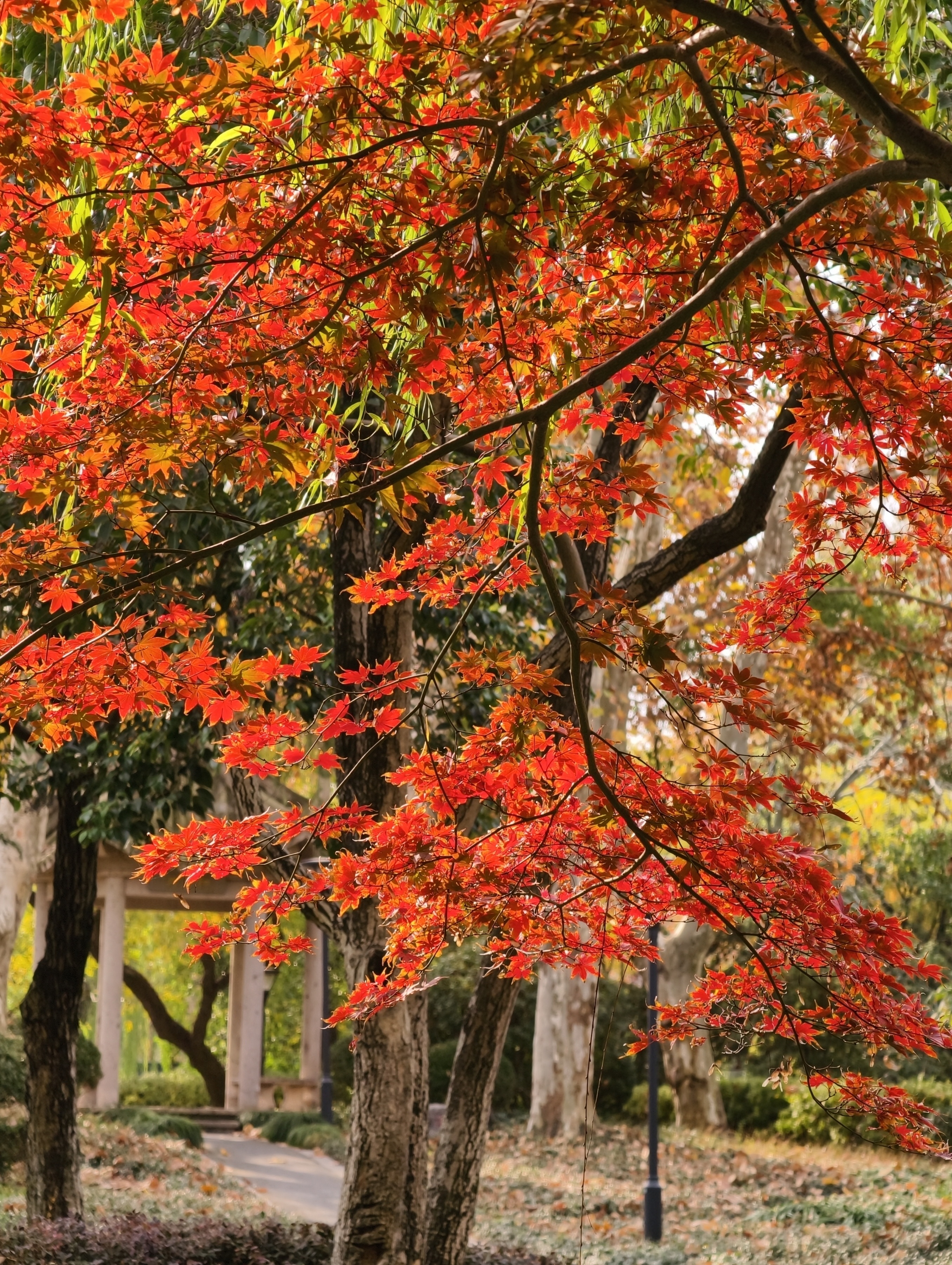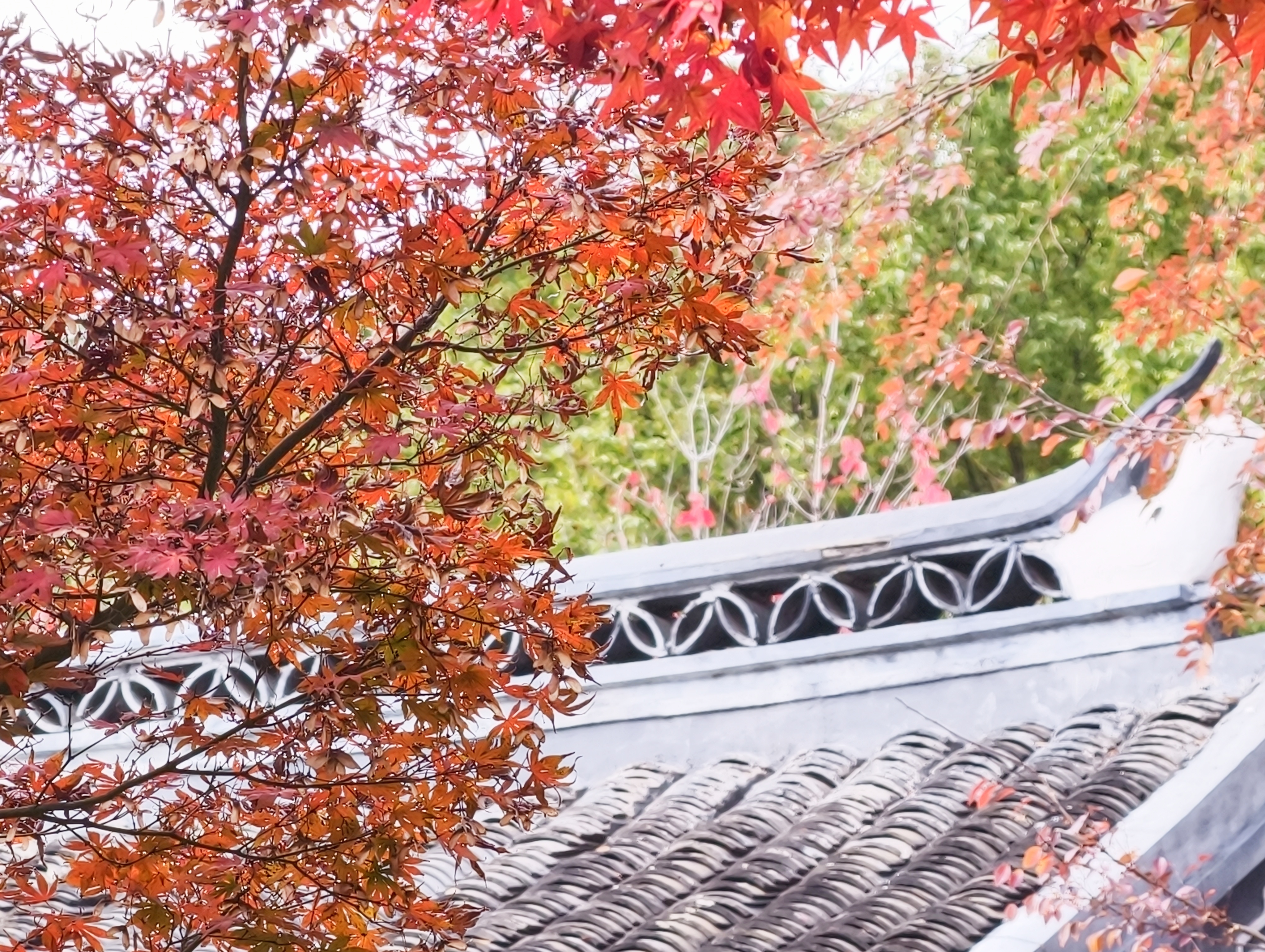 这里的红枫,或许规模不算大,却因依傍着园内中式古典建筑的白墙黛瓦,显得格外清雅入骨。风起时,红叶掠过翘角,拂过桥栏,亭台水榭间,将江南的婉约凝成一瞬的宁静。