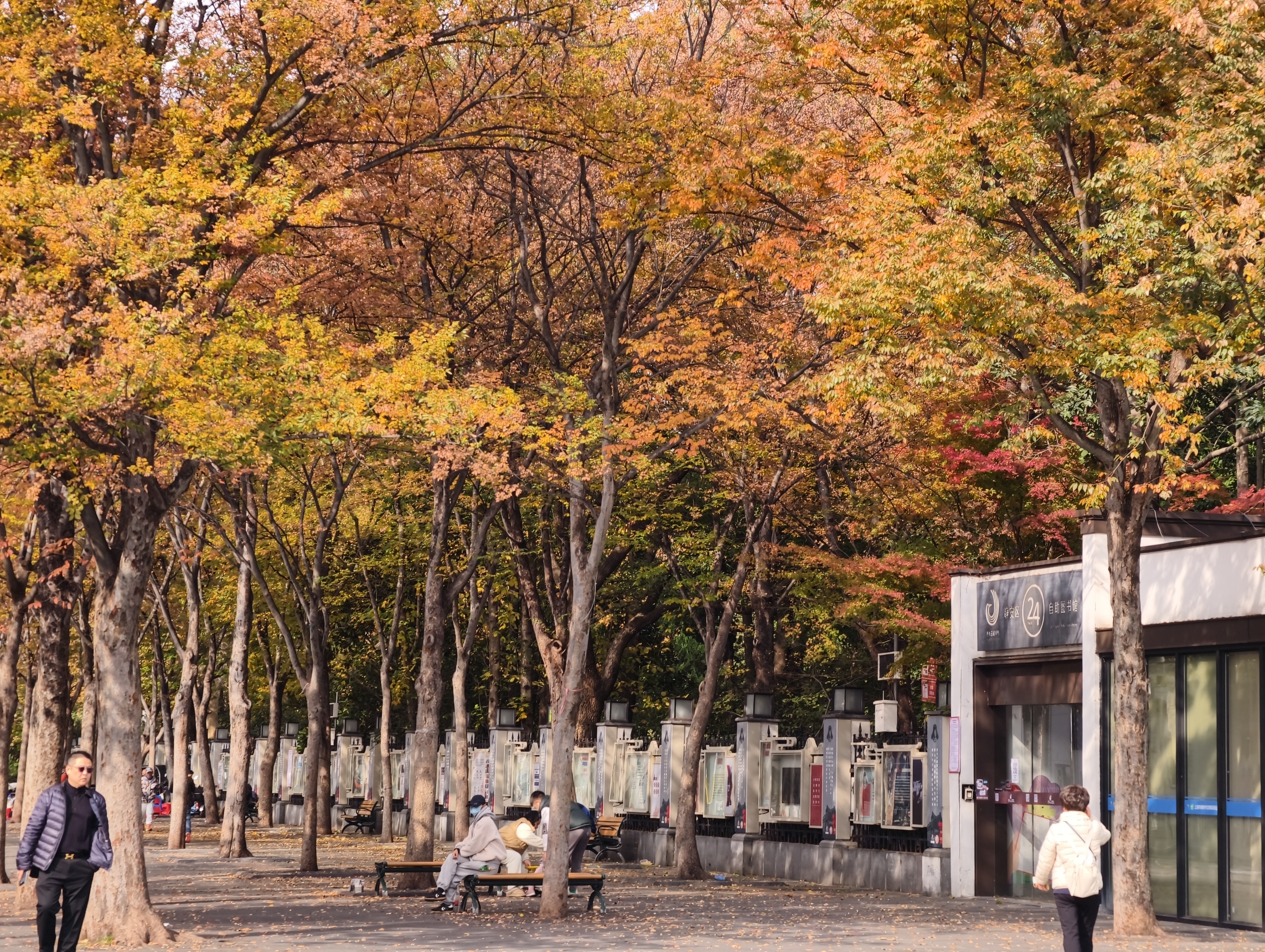 门外榉树广场更是惊艳——合抱之木撑开漫天斑斓,合抱之姿漫天斑斓,将高架路变成天然画框。
