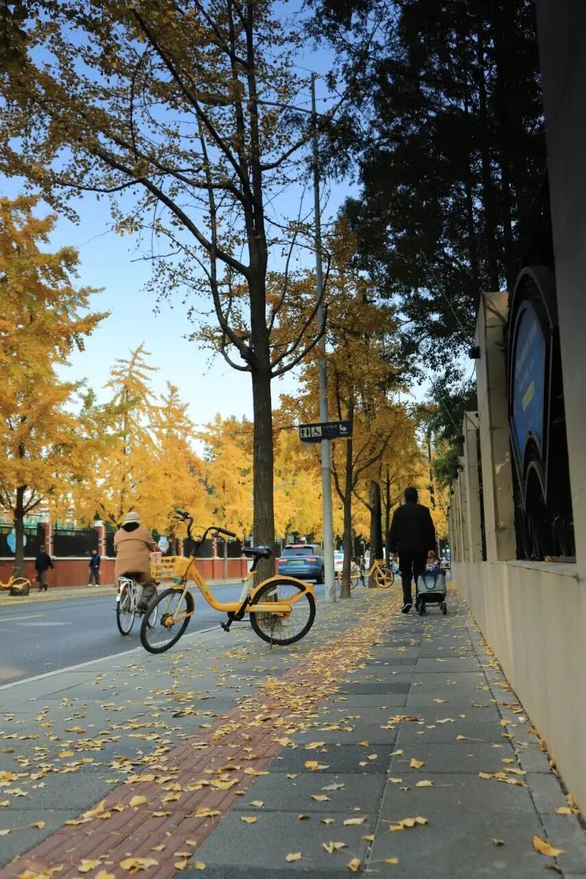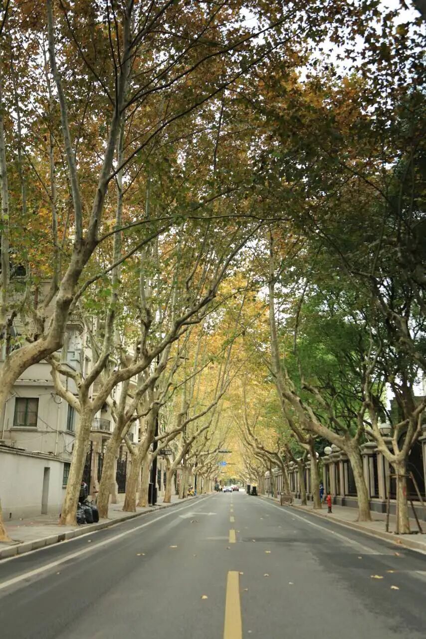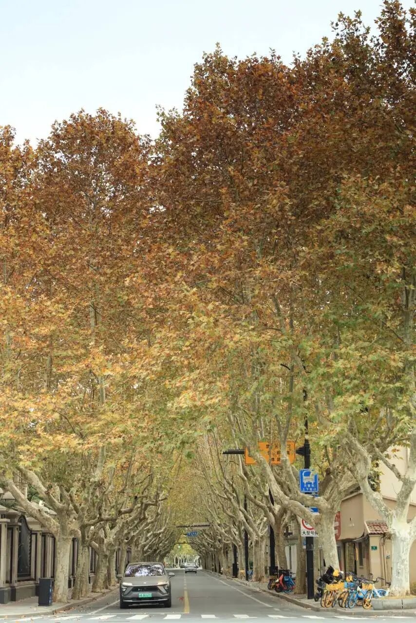 泰安路同样以悬铃木为主题,树木更为茂密,落叶堆积出丰富的层次。阳光透过枝叶,洒落在金黄地毯上,整条街笼罩在柔和的光影之中,形成沉浸感十足的秋景长廊。无论是漫步还是留影,都能深刻感受落叶与街道交融的静谧之美。