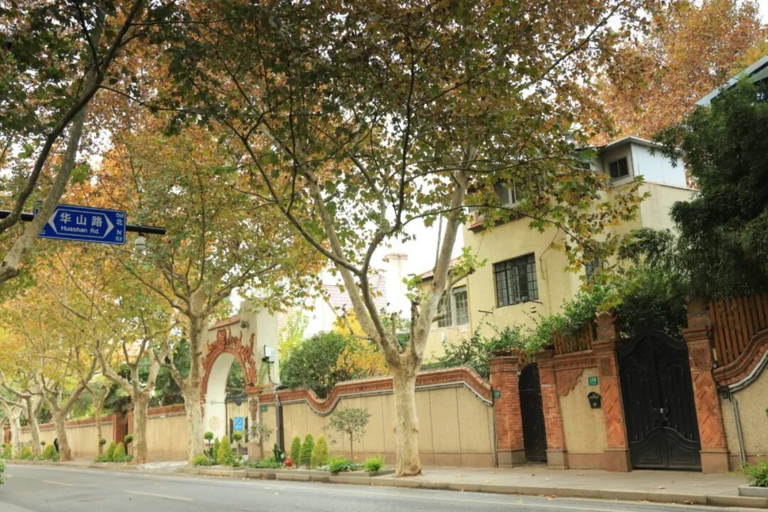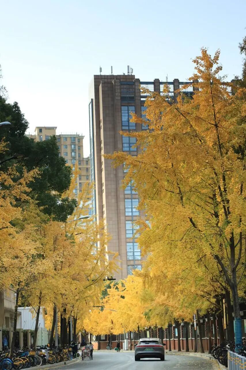 毗邻学校的天中路,秋意别具温情。银杏树洒下片片扇叶,落在红墙边,朱红与金黄交织出温婉明亮的校园风光。落叶堆叠,青春气息与季节诗意在此悄然融合,使这里成为长宁秋季中一处格外柔和的风景。
