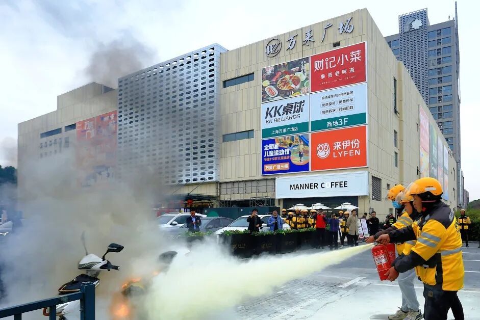 奉浦东部街区:演练环节则突出实战化,模拟电动车电瓶冒烟、起火等突发状况,组织骑手们参与应急处置,使其在实践中掌握紧急断电、快速疏散与初期控火的方法,将外卖小哥培养成为穿行在大街小巷的“移动安全哨兵”。他们不仅能及时自查自纠,更能在发现周边火情时第一时间做出反应,成为城市消防安全网格中的流动节点与预警力量。专业人员还现场演示了灭火器“提、拔、握、压”四步法,并组织全员实操与疏散演练,切实提升了参与者的灭火技能与自救互救能力。