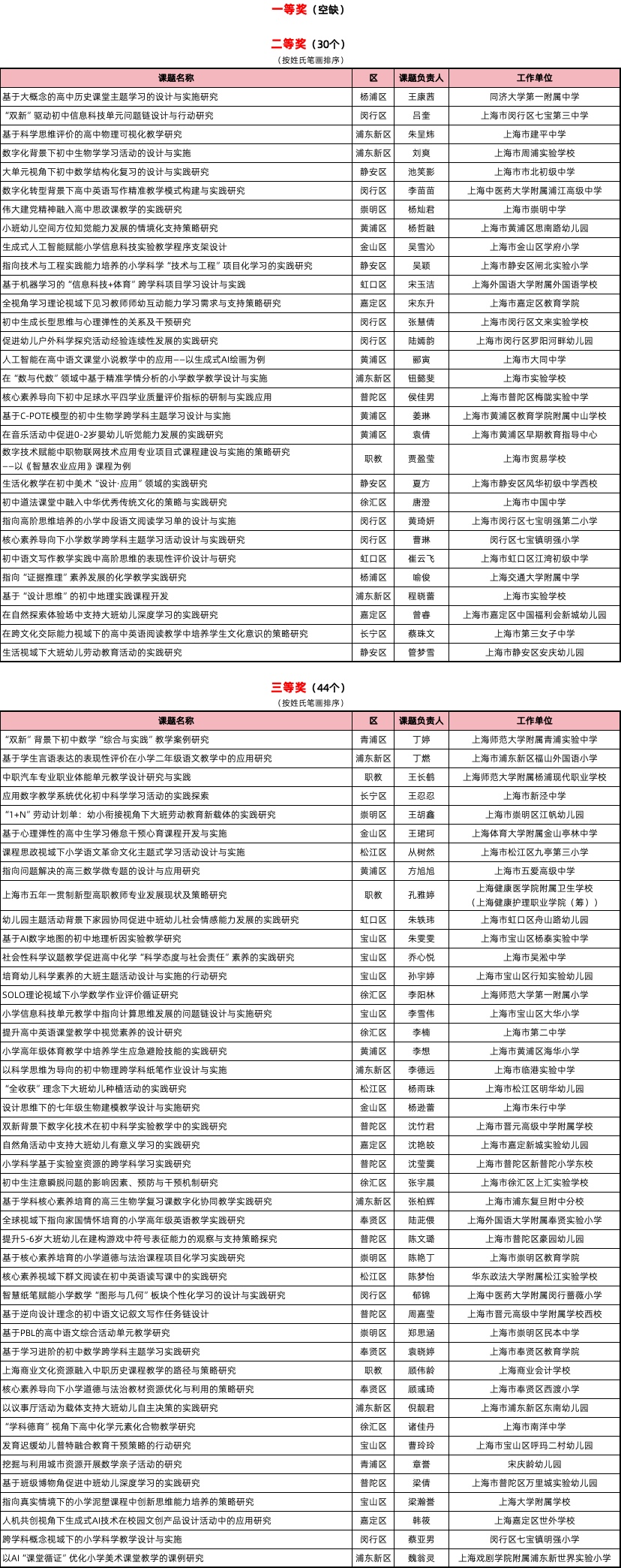 “2025年上海市青年教师教育教学研究课题结题优秀推荐活动”经专家评审,最终在申请结题139项课题中,评出拟获二等奖课题30、拟获三等奖课题44(一等奖课题空缺)。