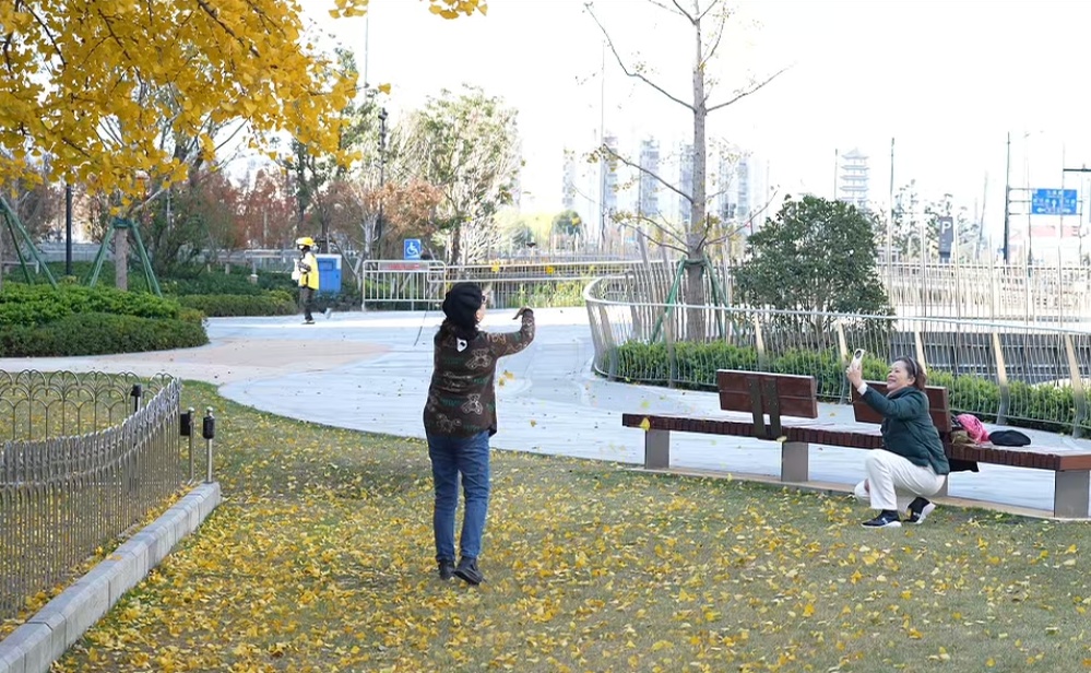 对于附近的居民而言,这棵树不仅是景观,更是生活的一部分——每年这个时节,金黄的叶片随风飘落,在广场地面铺就一层松软的地毯,吸引着散步的居民放慢脚步。许多居民每年都会来看看这棵树,“之前颜色还是蛮青的,今天看已经是金黄色的了,现在是银杏最漂亮的时间。你看它的树根,要几个人才围得住,一般的银杏没有这个效果。”