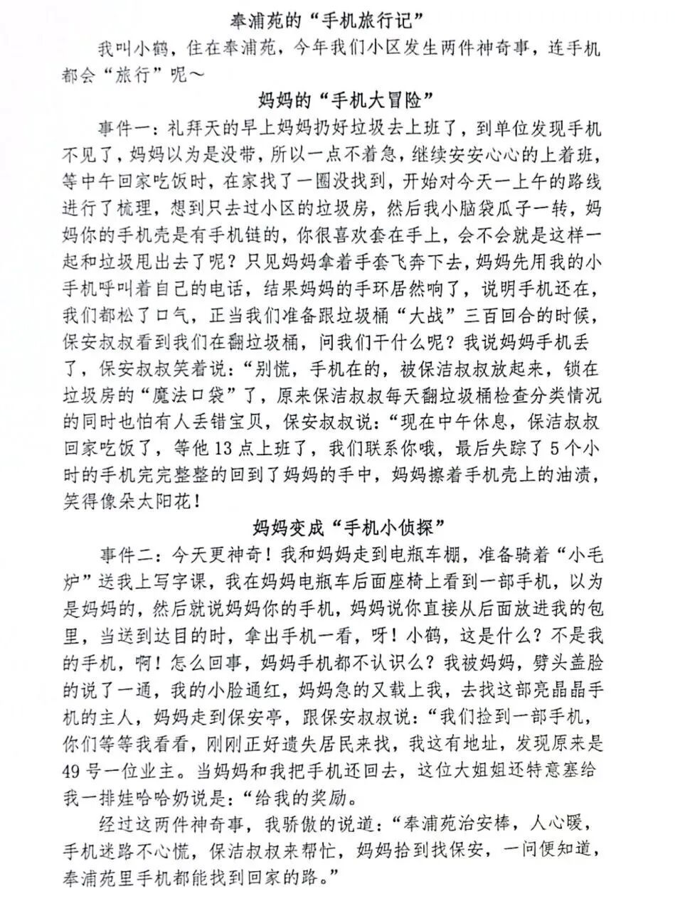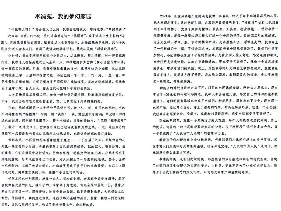 奉浦社区党总支精心组织“我眼中的小区之美”学生征文活动,以“小手牵大手”为纽带,通过孩子的视角挖掘小区人文与环境之美,激发居民共建共治和谐家园的热情。活动收到32篇投稿,优胜佳作在《奉浦苑之声》刊发,并将作品及感谢信同步推送至作者所在学校,让荣誉激励向外延伸,增强了居民的成就感,从而激发其参与社区治理的内生动力。
