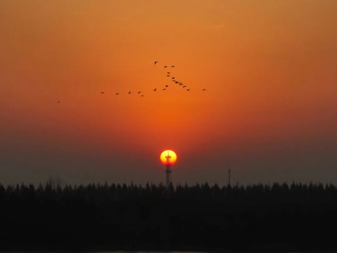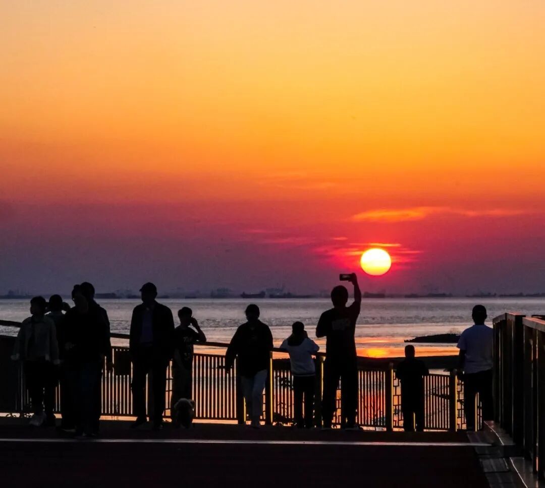 登上木质观景台,视野豁然开朗。眼前是浩浩长江,水天相接处正酝酿着一场盛大的色彩仪式。看落日如鎏金的火球缓缓沉降,将整片水域染成渐变的金橙色——这是崇明赠予你最开阔的告别礼。