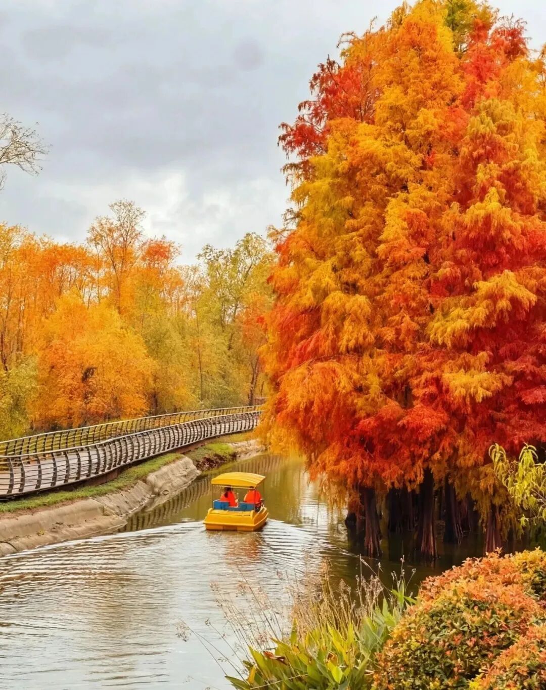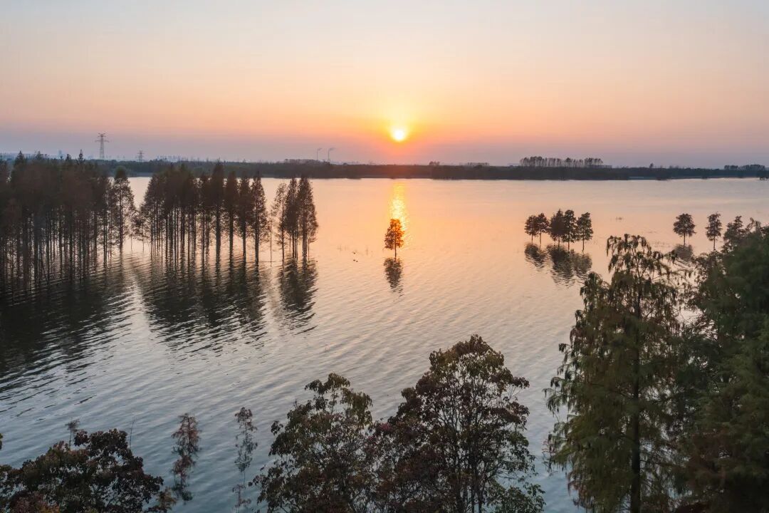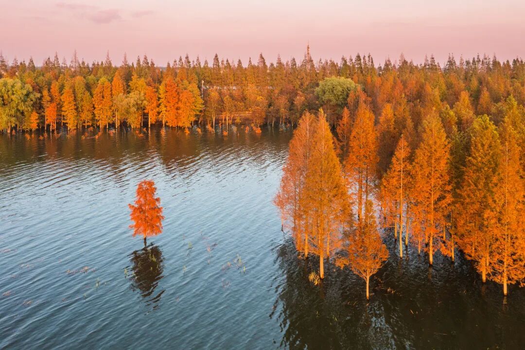 在漫屿户外营地租一叶皮划艇,轻轻划入那片静谧水域。眼前景象瞬间不同:上百棵水杉直接从清澈的湖水中挺拔而起,冬日褪去叶片,只剩下疏朗而有力的枝干,在水中倒映出简洁而重复的几何线条,仿佛大自然亲手绘制的素描。或悠闲的摇着湿地的四人游船,置身于秋冬美景中。