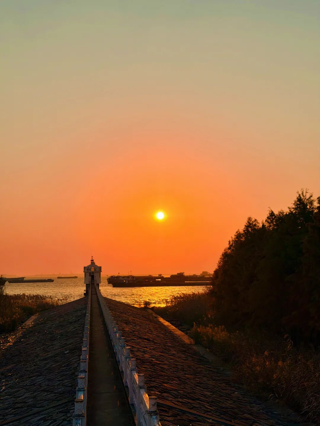 如果你还来得及,那就去崇西水文亭感受一下不一样的落日晚霞。整片西天的光潮涌向江面,水文亭的轮廓逐渐融化在暖调的光雾中。此时不必刻意构图,只需安静站在引桥上,按下快门——画面中那抹小小的白色剪影与浩瀚的暖色江天形成的对比,已足够讲述一个关于孤独与陪伴的黄昏故事。当夕阳的最后一抹余晖隐入江面,天空开始上演从橙红到粉紫的渐变秀——这一刻,所有奔赴都值得。