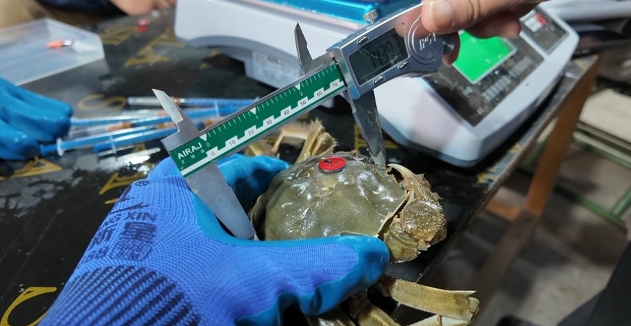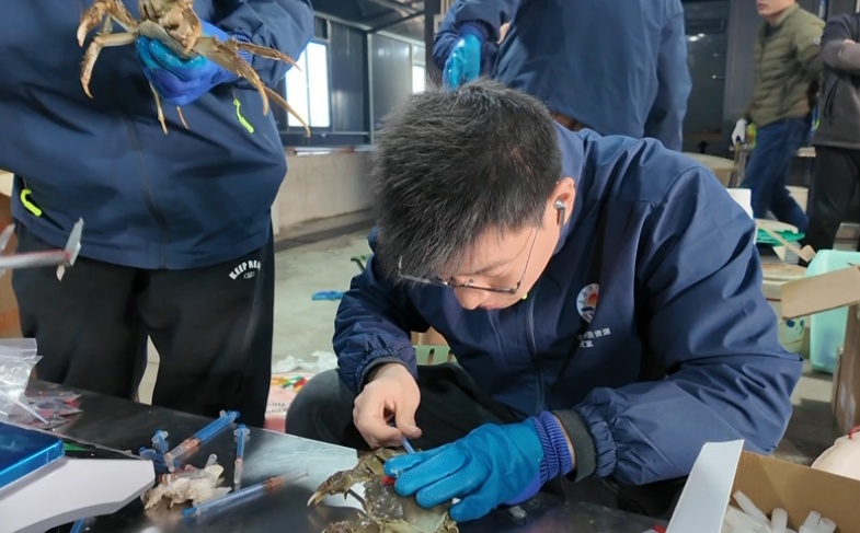 “我们正在给河蟹抽血,回实验室之后再进行基因检测,筛选更好的亲本。”上海海洋大学科研人员介绍,团队将对河蟹的体长、体重以及体形特征等关键数据进行详细记录,确保每一项数据都准确无误。这一步骤不仅为后续的选育工作提供了重要的参考依据,也为河蟹品质的全程追溯提供保障。