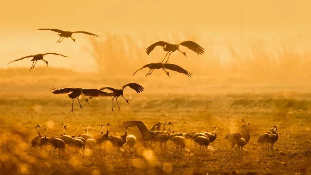 东滩的深秋,不仅是植物的交响乐,更是生命的协奏曲。作为东亚-澳大利西亚候鸟迁徙路线上的重要驿站,此时成千上万的候鸟在此停歇、觅食。远眺处,成群的鸟儿或在金黄的芦苇上空翩跹起舞,或在滩涂上悠然踱步,为这片静谧的金色世界注入了无限的生机与活力。