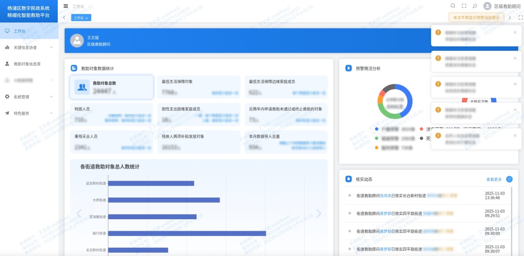 完善技术保障机制 确保系统高效运行 为确保系统稳定运行和功能持续优化,杨浦区民政局委托专业第三方建立了专项技术保障团队,及时响应和解决系统运行中的各类问题。 根据基层工作实际需求,系统功能不断更新完善,先后新增了救助金额填报等功能模块,优化了数据导入、查询等操作体验,改善了账号登录等界面设计,有效提升了工作效率。 展望未来,杨浦区民政局将继续探索更多相关业务系统的数据联动,进一步提升救助工作的智能化水平,让每一位困难群众都能及时享受到救助政策的温暖关怀。