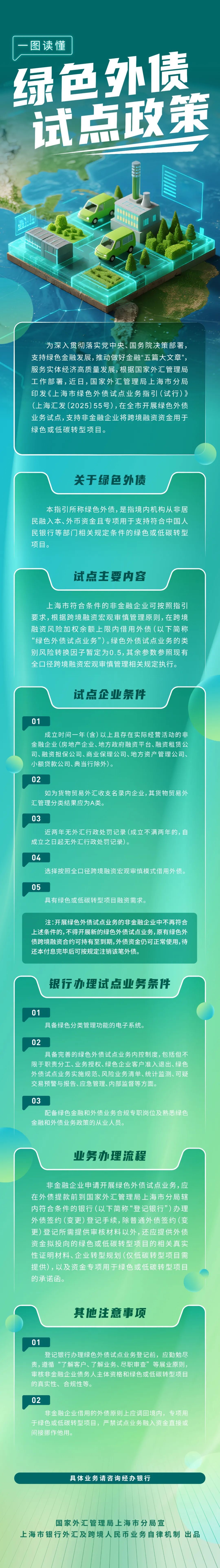 为深入贯彻落实党中央、国务院决策部署,积极支持绿色金融发展,推动做好外汇管理服务金融“五篇大文章”,国家外汇管理局上海市分局(以下简称“上海市分局”)以“绿色外债”为着力点,加强绿色低碳产业跨境融资便利化政策支持,经国家外汇管理局批准,上海市分局于近日在全市开展绿色外债业务试点。试点政策优化了符合条件非金融企业的跨境融资宏观审慎管理,允许专项用于绿色发展或低碳转型项目的外债资金在统计跨境融资余额时,可占用更少的外债额度,精准支持企业借用外债扩大投资绿色发展或低碳转型项目,提升全球资源要素向我国绿色低碳发展领域的配置效能。截至2025年11月底,3家“双碳”重点企业率先签约“绿色外债”,融资总额突破三亿元人民币,为分布式新能源、储能中心和循环经济等前沿绿色科技项目建设注入强劲动能,试点政策先发示范效应凸显。