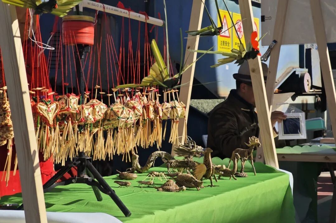 非遗棕编摊位上手工编制的动物活灵活现,12生肖形态各异,龙飞凤舞齐聚一堂,还有青棕叶做的蝴蝶在风中摇曳。