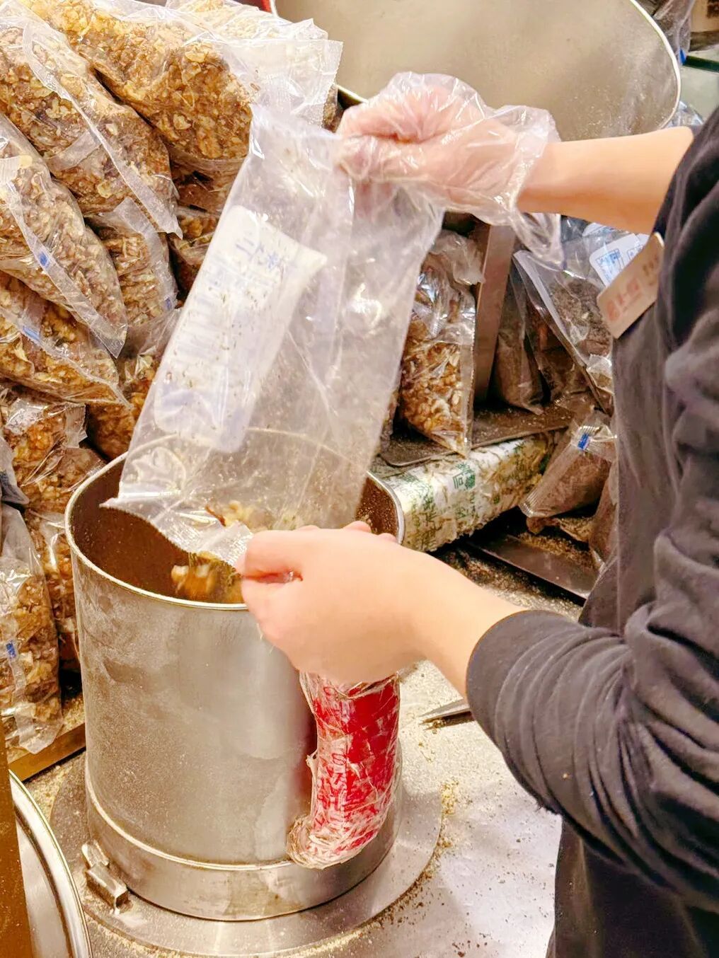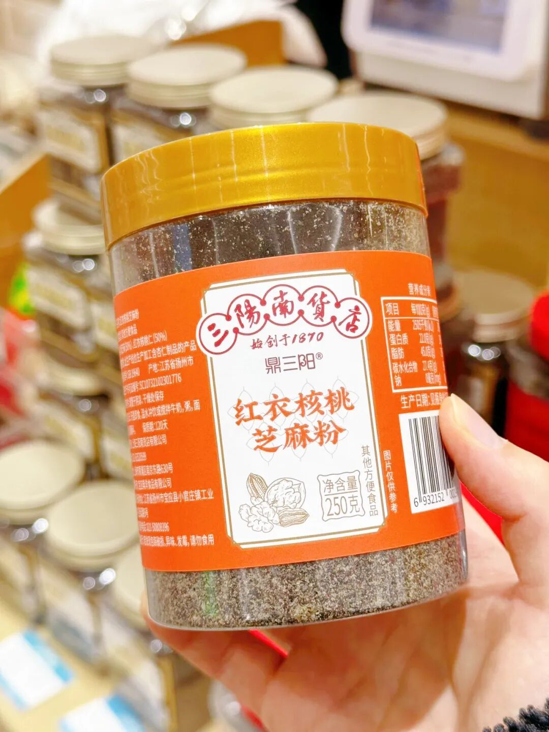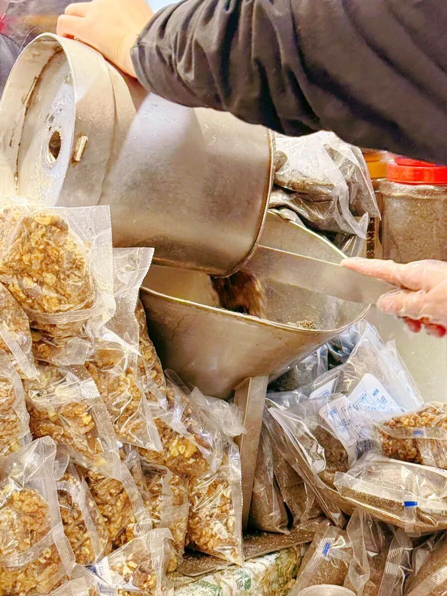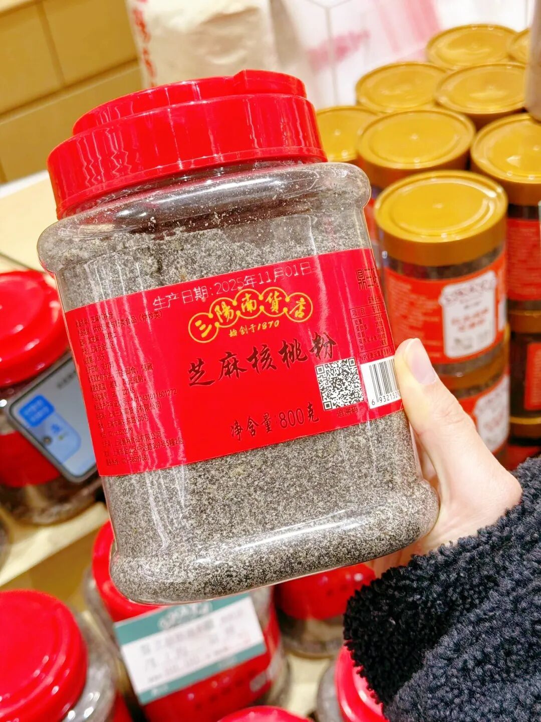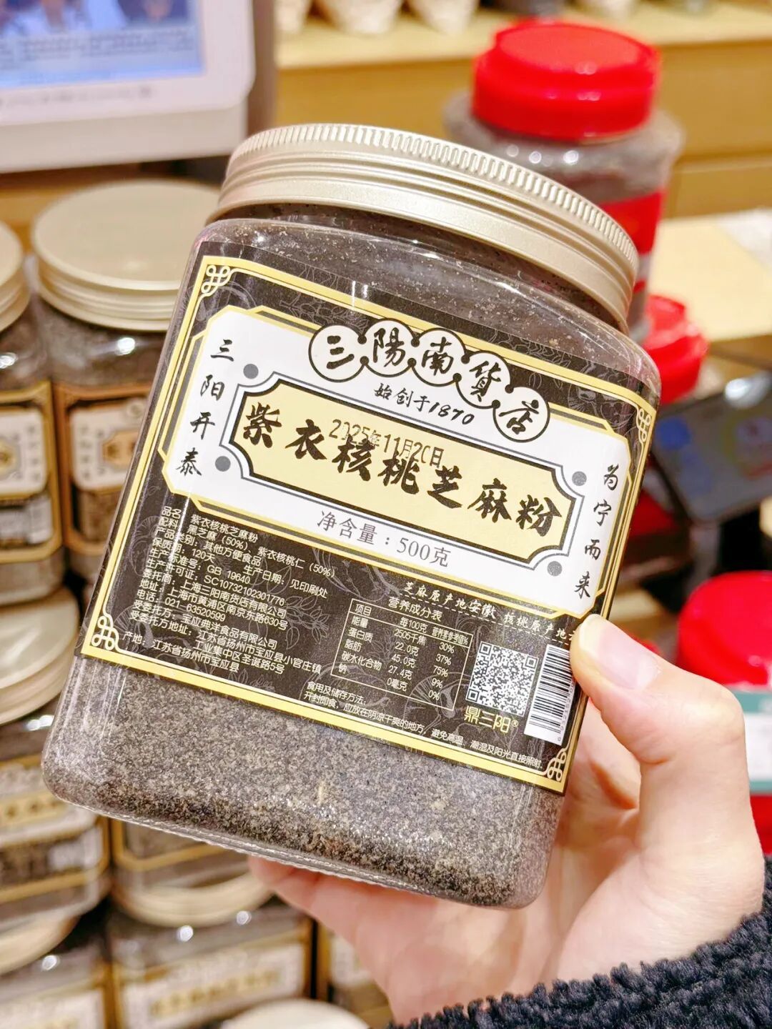 要论冬日养生菜单里的绝对 C 位,芝麻核桃粉当仁不让!三阳南货店的现磨柜台就很权威了。乌亮的芝麻与饱满的核桃仁铺得满满当当,研磨中,金黄的油脂渗出,细腻的粉末簌簌落下,香气能飘半条街。
