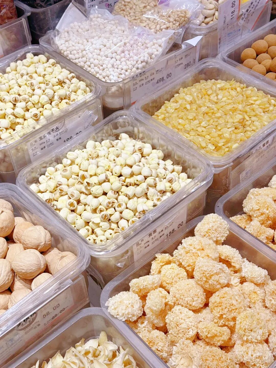 走进任何一家,南北干货区都是一片丰饶景象。红枣皮薄肉厚;桂圆粒大圆整;莲子颗颗饱满...不仅三阳南货店的干货非常全,邵万生、泰康、第一食品等同样有出色的干货阵营!从日常炖汤的香菇、木耳,到较为名贵的羊肚菌、竹荪,都能找到。店员会热情地告诉你:“我们这个香菇,香味不一样的。”