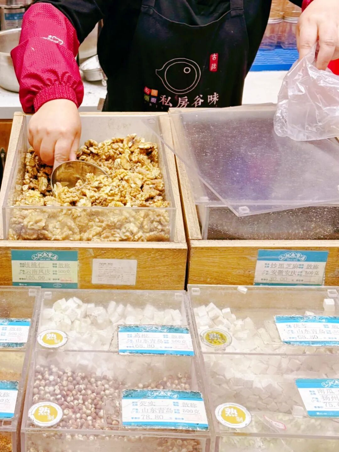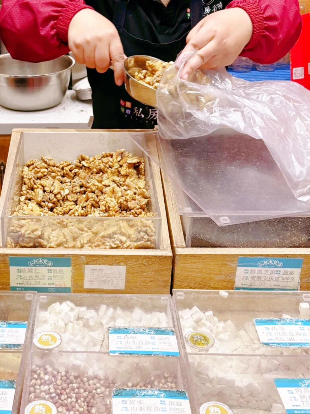 第一食品商店 2 层的现磨柜台一包包核桃仁堆成了小山。熟客们在窗口外将刚磨好的芝麻核桃粉熟稔地装袋,这种“新鲜直达”的体验充满参与感。阿姨爷叔个性定制“核桃多点”、“糖少放”,店员麻利地一一满足。