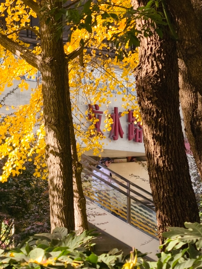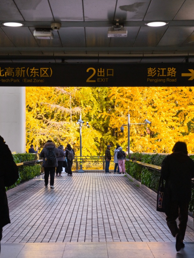 值得注意的是,2号出口处的人行天桥成为天然的“观景台”,巧妙缩小了人与树木的高度差,让市民游客能轻松与银杏“同框”。在站台候车时,窗外掠过的金色树影;或是在出口通道内回望,框出一幅生动的秋景画,都成了无需刻意寻找的美丽邂逅。