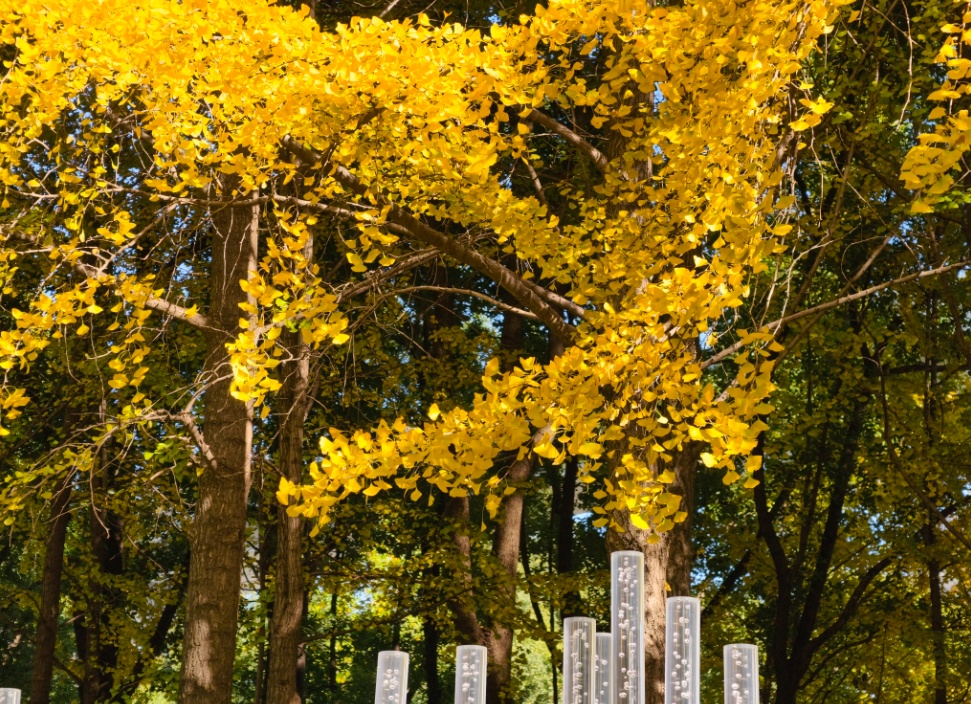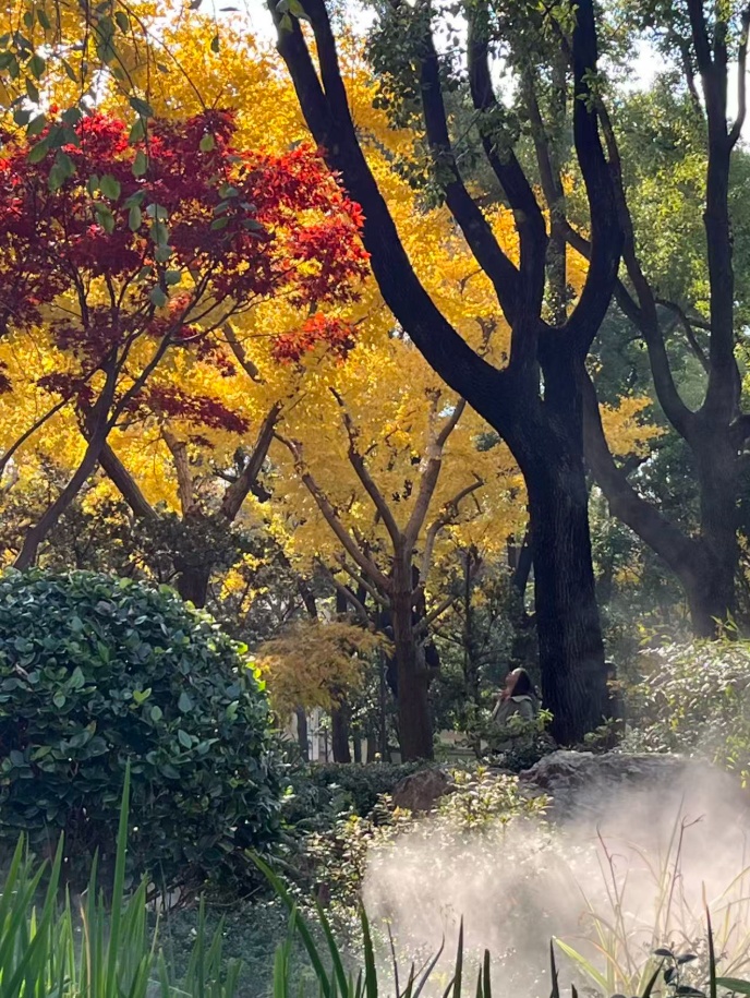 林中框景阶梯:步入公园,巧妙利用银杏叶作为前景画框,将远处的人行阶梯与行人定格其中,层次与意境瞬间拉满。